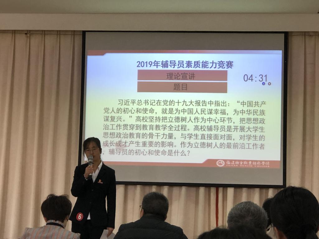 2019年12月13日,福建卫生职业技术学院辅导员素质能力大赛总决赛在行政楼6楼举行,我系辅导员赵茜老师代表健康管理系参加决赛。经过激烈的角逐,赵茜老师荣获福建卫生职业技术学院辅导员能力大赛总决赛二等奖(第三名)的好成绩。