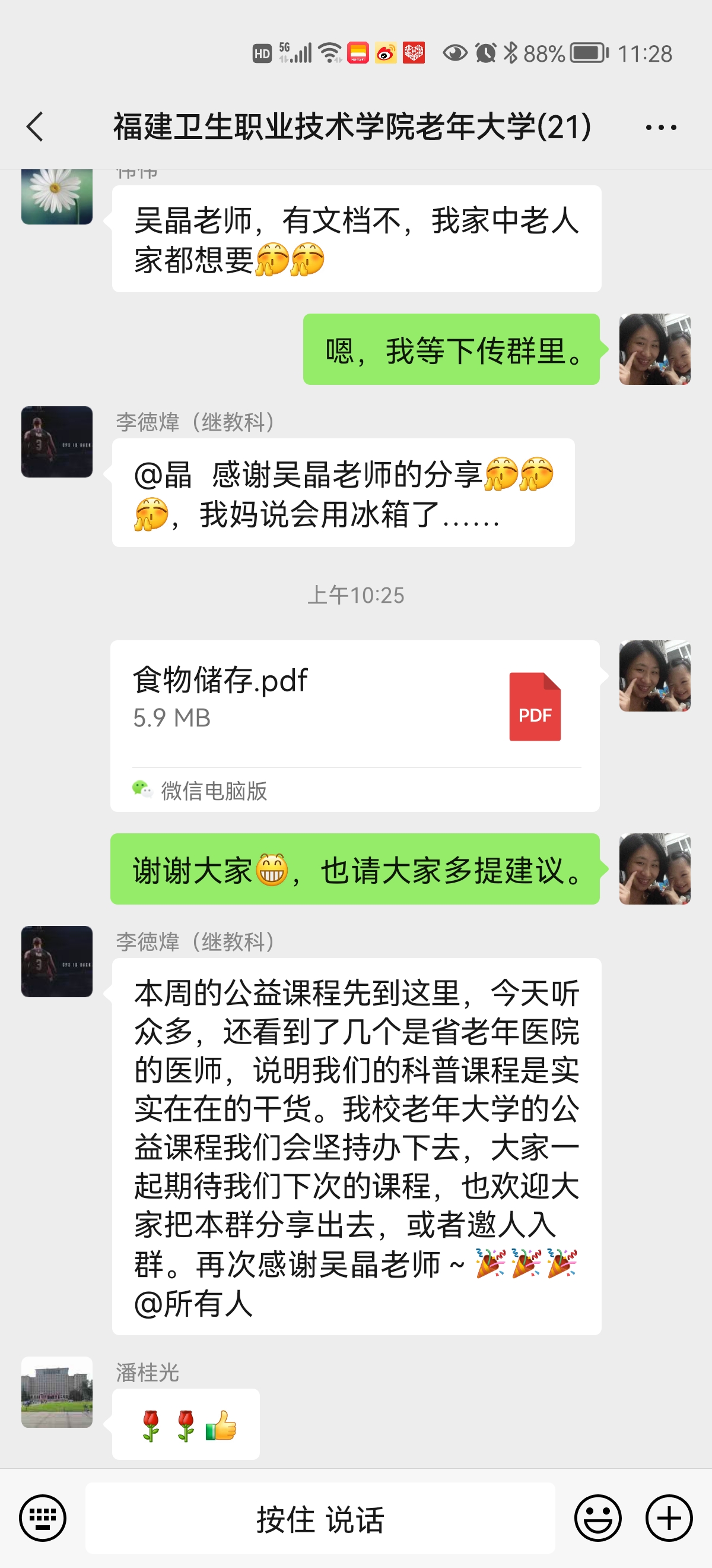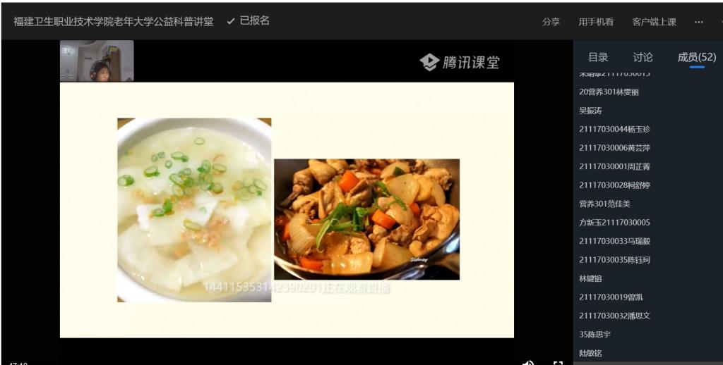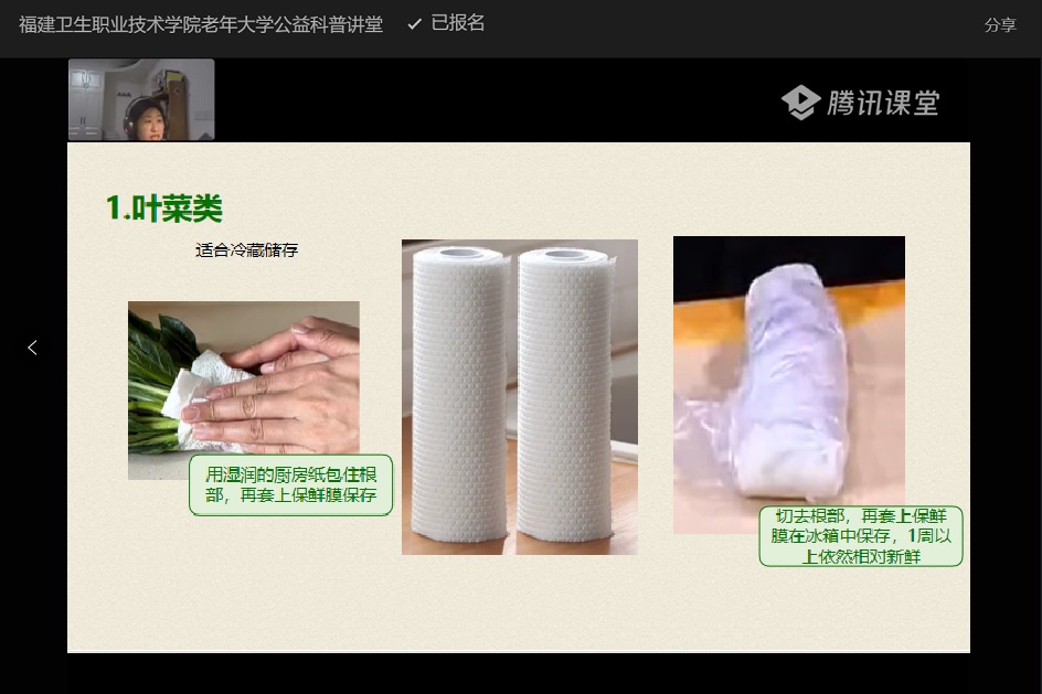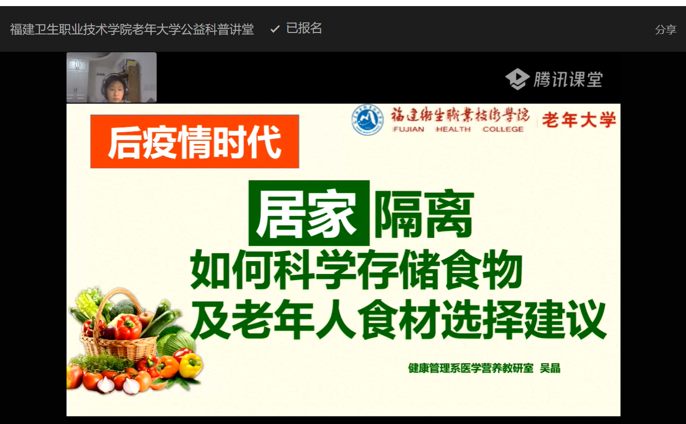 根据《教育部等十部门关于做好2022 年职业教育活动周相关工作的通知》(教职成函〔2022〕3号)要求,为深入学习贯彻习近平总书记关于职业教育的重要指示精神和全国职业教育大会精神,5月15日上午,福建卫生职业技术学院健康管理系医学营养教研室吴晶老师给給福建卫生职业技术学院附属老年大学一期学员开展了以《后疫情时代居家隔离如何科学储存食物及老年人食材选择建议》为题的公益科普讲座。讲座中,吴晶老师利用专业技术知识,围绕“技能服务美好生活”话题,用深入浅出的语言和实操性极强的生活建议为学员们提供防食品安全、健康餐饮中的科学指导。