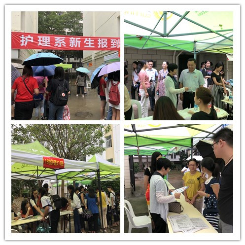 报到当天,结合护理系的实际情况,将报到处设置在5号学生公寓楼下,同时,在过道外墙和各班报到办公桌上均张贴排班名单、报到流程图、学费说明等。在现场,系部领导老师耐心回答新生和家长的各种咨询,介绍护理系办学特色和相关专业的基本情况,并及时为困难学生开设“绿色通道”服务;志愿者们带着新生完成入学的各项手续。护理系热情的志愿者,慈祥的老师以及一切人性化的服务,令远道而来的学生和随行的家长感到由衷的满意。使新生及家长第一时间感受到学校的温暖,为新生和家长留下美好的印象。