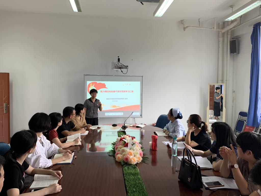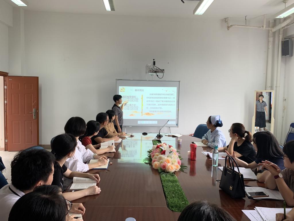 2019年5月13日至5月31日,全省36所高校50位全省党建工作标杆院系培育单位党委书记(党总支书记)在福建省委党校和上海交通大学组成第26期高校处级干部示范班进行学习。护理系党总支谢涛书记参加了此次学习,为将学习精神传达给广大党员同志,谢涛同志于2019年6月27日在护理系301会议室向护理系党员同志汇报了学习体会。