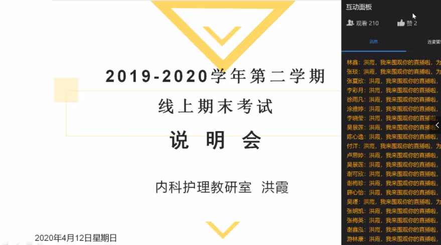 为使考生对“考生须知”有进一步清晰认识,2020年4月12日晚,护理系第二党支部“双带头人”洪霞带领支部党员教师们分别以钉钉直播方式面向16级五年专和18级三年专护理、助产专业的校内外共计35个行政教学班的全体师生开展一场别开生面的“2019-2020学年第二学期线上期末考试说明会”。直播活动分为解析和答疑两个环节,党员教师们从考试时间、考试形式、考试题型及考试注意事项等方面对“考生须知”进行深入浅出的解释,耐心的针对学生的疑问一一进行精准答疑,每个直播现场师生互动气氛活跃,从7点30分一直持续10点30分,同学们还意犹未尽。