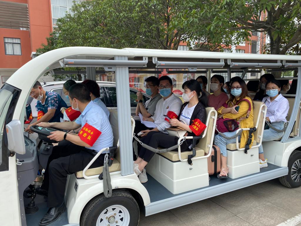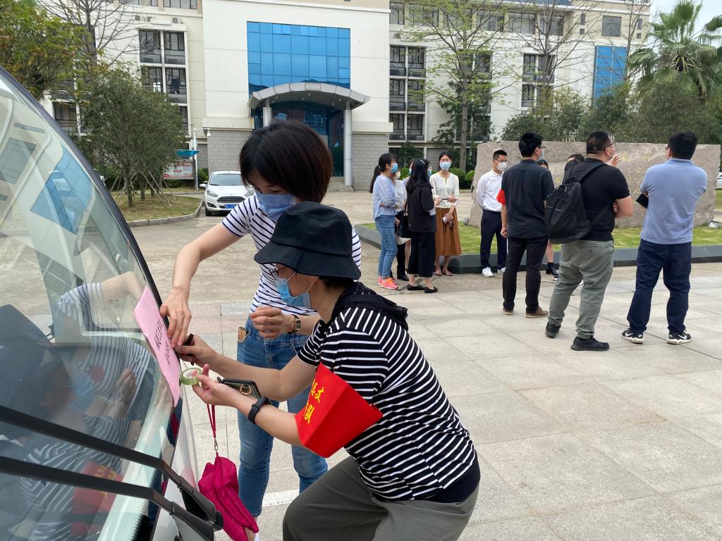 护理系党总支党员突击队队长谢涛为接送学生车辆粘贴车标
