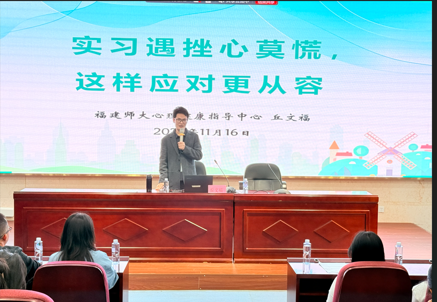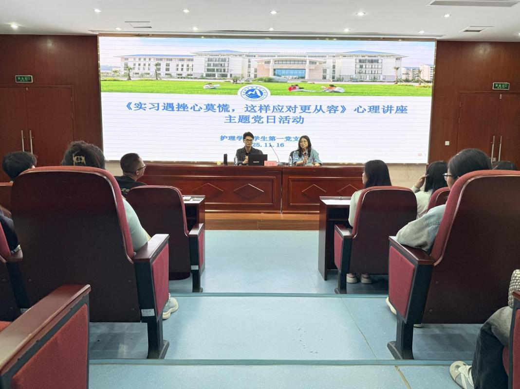 11月16日晚,护理学院学生第一党支部在笃行楼四楼报告厅开展“实习遇挫心莫慌,这样应对更从容”专题讲座党日活动。活动特邀福建师范大学心理健康指导中心专职教师、国家二级心理咨询师丘文福主讲,护理学院师生通过线上线下结合的方式参与,旨在帮助学生缓解心理压力、提升心理调适能力。