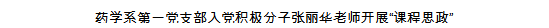 “组织支部教师党员开展‘课程思政’是我们样板支部的一项重要工作,特别是‘双带’履职以来,更强调党员要结合自身专业优势开展课程思政,重视思政教育的自然融入,力求做到如盐入水,润物无声。”药学系第一党支部组织委员陈钰老师说。