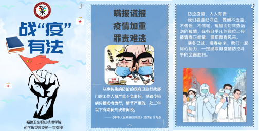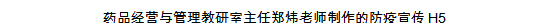 “佩戴口罩固然可以阻断新冠病毒的飞沫传播,但却难以阻断网络“喷子”的飞沫传播,培养学生的法律意识,帮助学生知法、守法,是《医药市场营销》课程思政的切入点之一。” 药经管教研室主任郑炜老师侃侃而谈,她是药学系第一党支部的优秀党员,她积极响应支部号召,组织人手制作了题为“万众一心,战‘疫’有法”的H5,对疫情防控过程中容易被忽视的违法行为进行了宣传,她主讲的在线课程,通过“云班课”的头脑风暴功能,组织学生分析热点事件,坚定守法意识,受到学生们的欢迎。