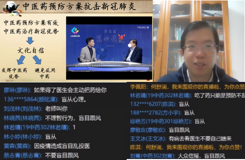 何舒澜老师主讲的《中药学》在线课程,从“一夜间‘双黄连’成为比口罩还紧俏的存在”说起,引发学生对防控疫情期间部分民众哄抢“双黄连”这一事件的讨论与思考,引申出中药在疫情防控中如何发挥作用的问题,教育学生既要肯定中药在防控疫情中的重要作用,树立文化自信并激发民族自豪感,又要避免陷入乱用中药的误区,坚持在中医理论指导下正确使用中药。短短十几分钟的互动,不仅围绕时政热点激发学生共鸣做到思政教育,同时也在专业层面讲清了中药的含义,全程学生积极参与,踊跃发言,取得了良好的授课效果。
