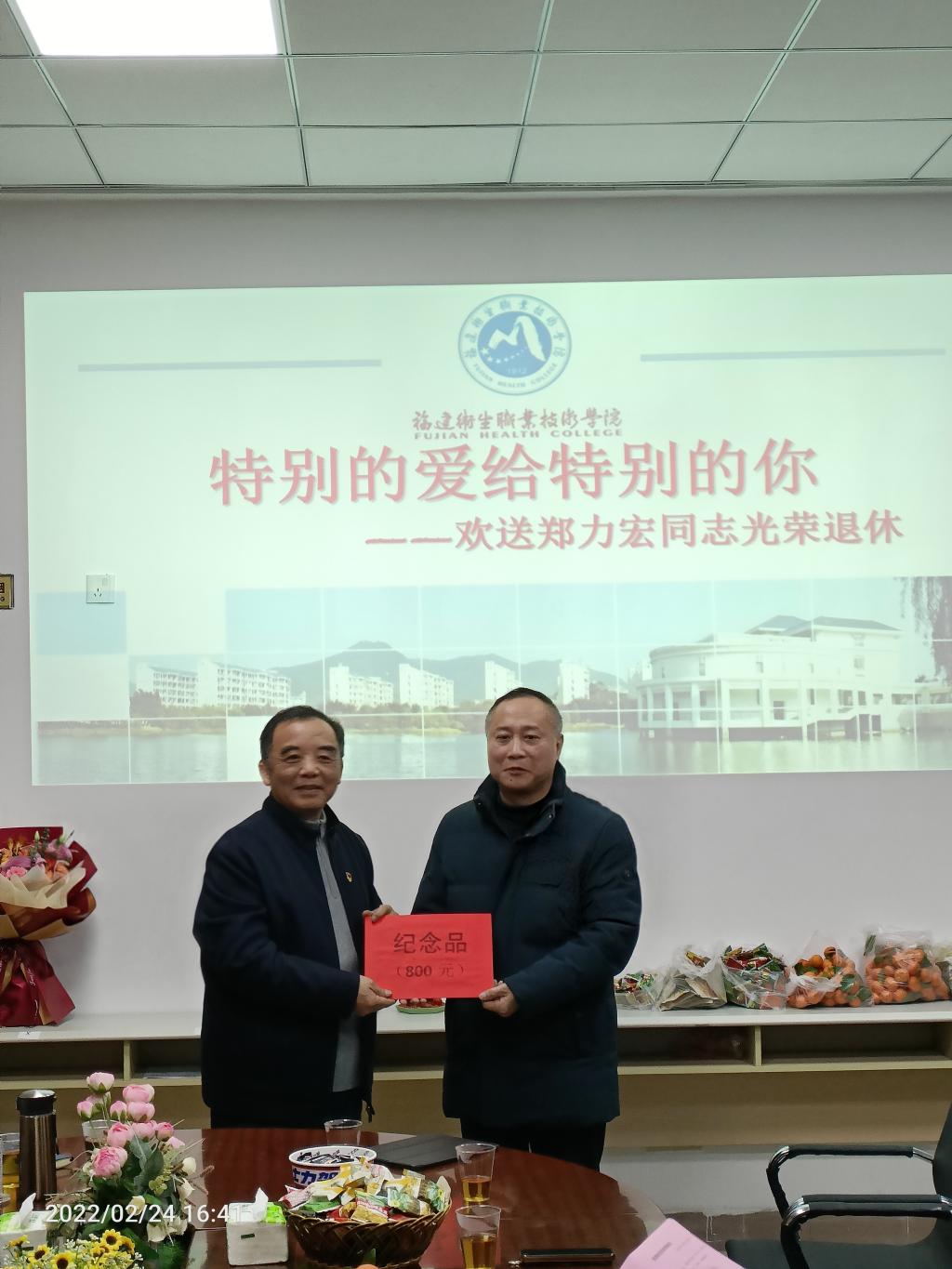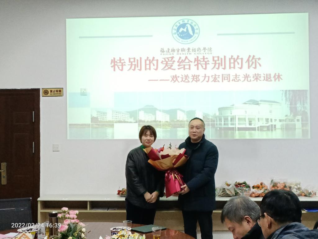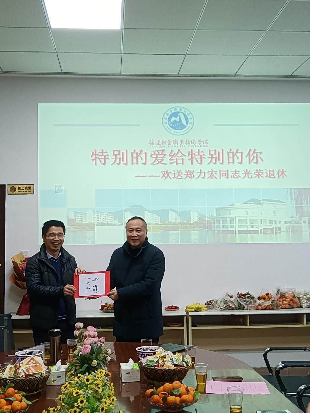 李美华代表学校向郑力宏颁发退休证书和退休纪念章。