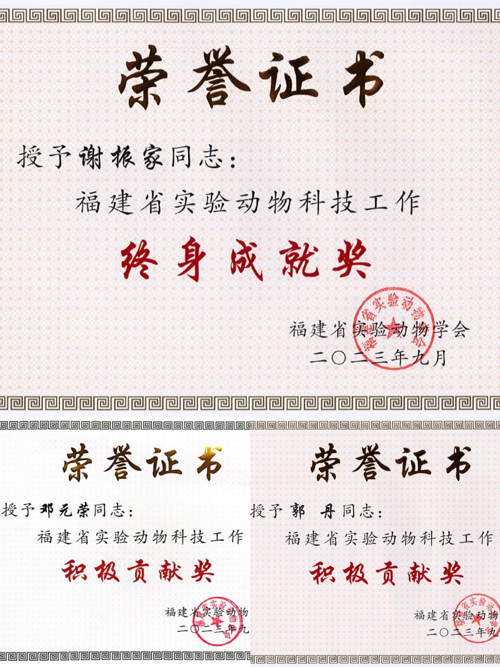 会上,我校退休教师谢振家荣获福建省实验动物学会“终身成就奖”,邓元荣、郭丹获评“积极贡献奖”。奖励设置是为弘扬科学家精神,激励实验动物科技工作者,以表彰对福建省实验动物科学建设与发展作出突出贡献的科技工作者,铭记功绩、激励后人。