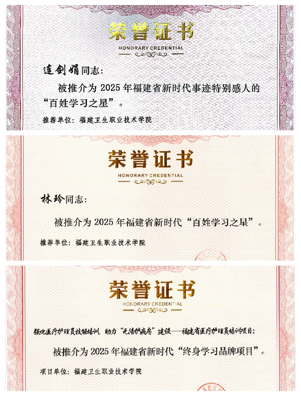 开幕式上,福建省教育厅举行表彰仪式,对2025年省级“百姓学习之星”与“终身学习品牌项目”的入选对象进行表彰。得益于前期在终身教育重点项目上的积极投入与建设,我校在此次表彰中取得了显著成绩:继续教育学院联合护理学院申报的“强化医疗护理员技能培训,助力‘无陪护病房’建设——福建省医疗护理员培训项目”荣获2025年福建省新时代“终身学习品牌项目”;护理学院连剑娟副教授、药学院林玲副教授荣获2025年福建省新时代“百姓学习之星”。