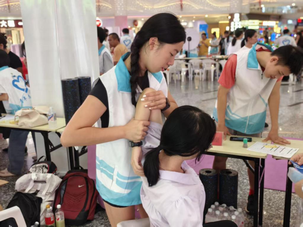 活力无限健康挑战区,体育保健组以PNF拉伸为主题,演示“收缩-放松”原理,帮市民缓解肌肉紧张。