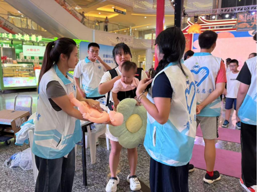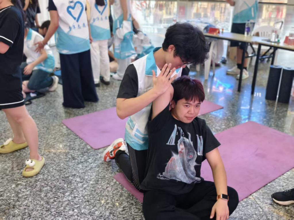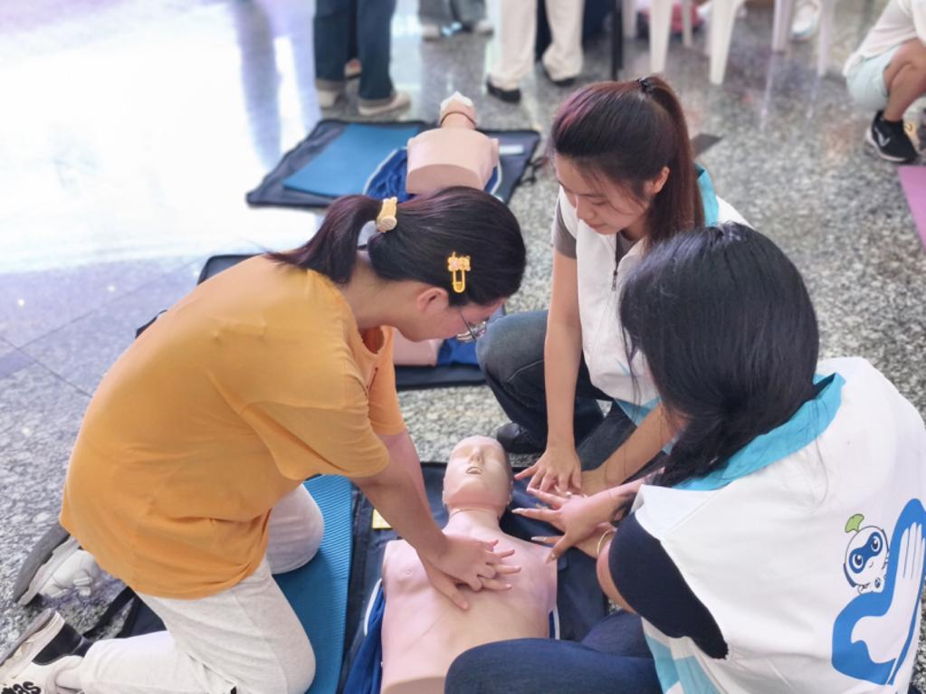 生命守护急救站里,健康管理组师生现场演示心肺复苏与海姆立克急救法,市民们轮番上阵实操,志愿者手把手纠正动作细节。