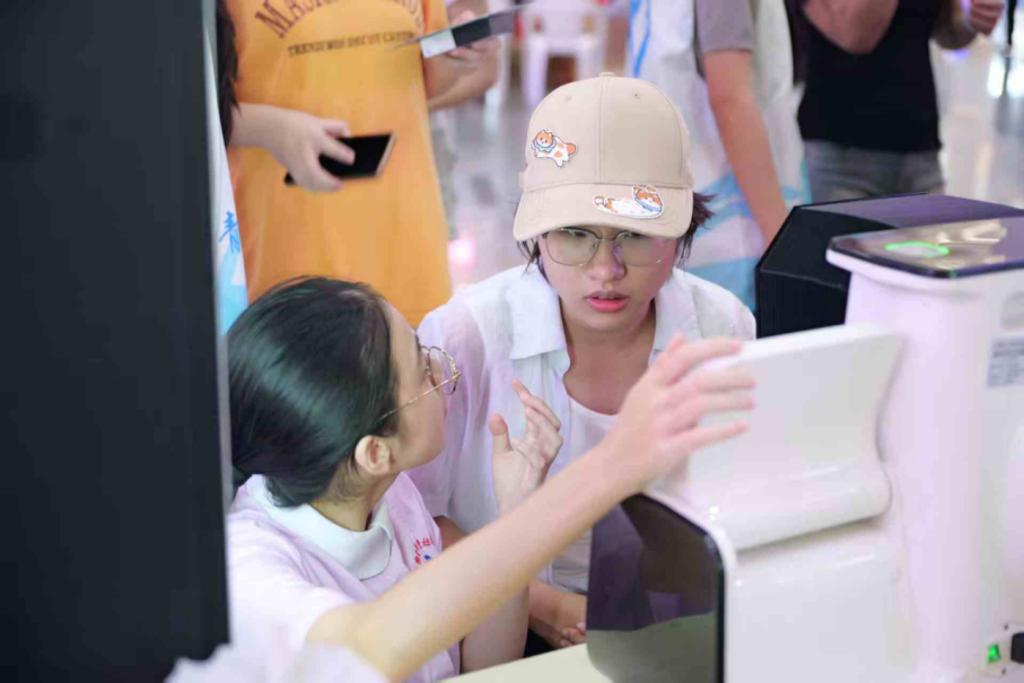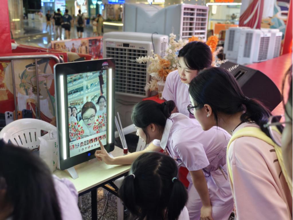 健康美丽咨询台配备专业皮肤检测仪与魔妆镜,为居民进行面部肤质分析与AI妆容试妆。检测仪能够清晰显示皮肤水分、油脂、毛孔、色斑等状况,提供专业精准的美容护肤建议。