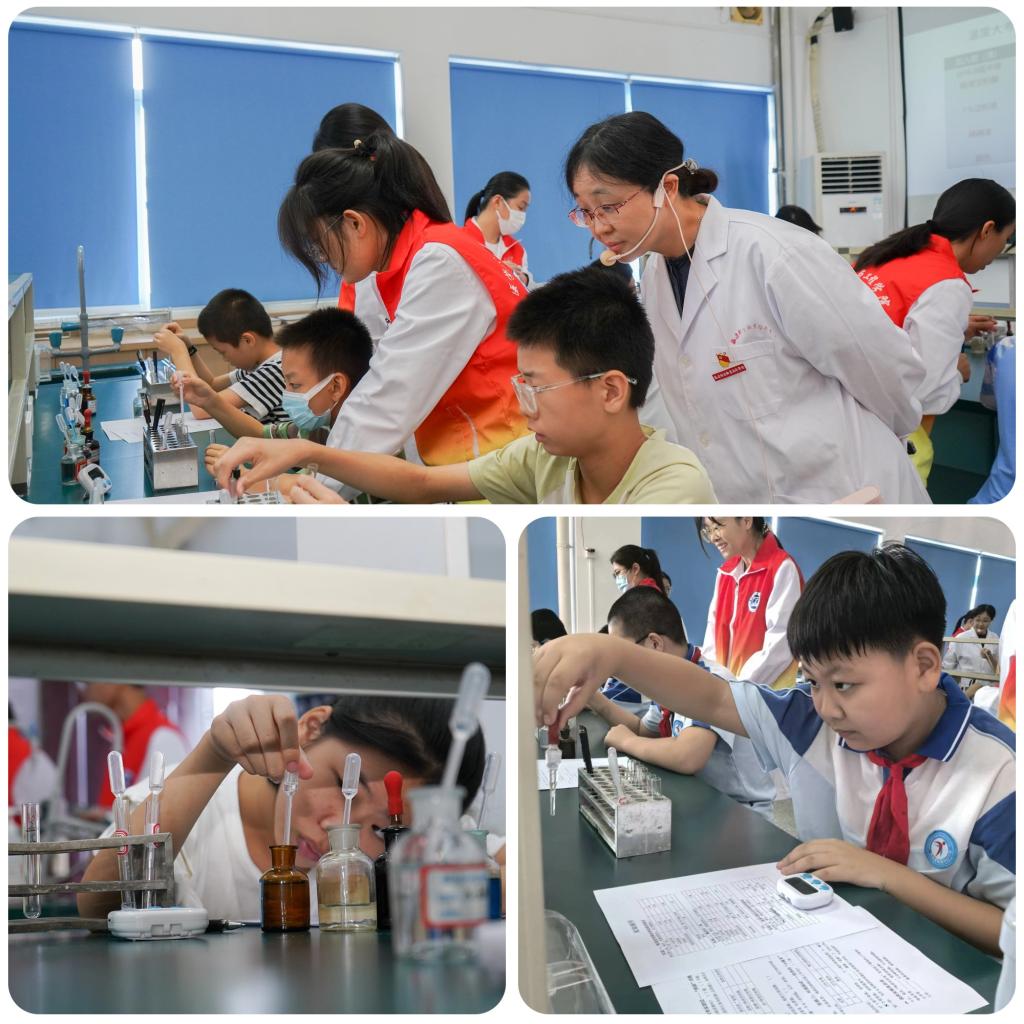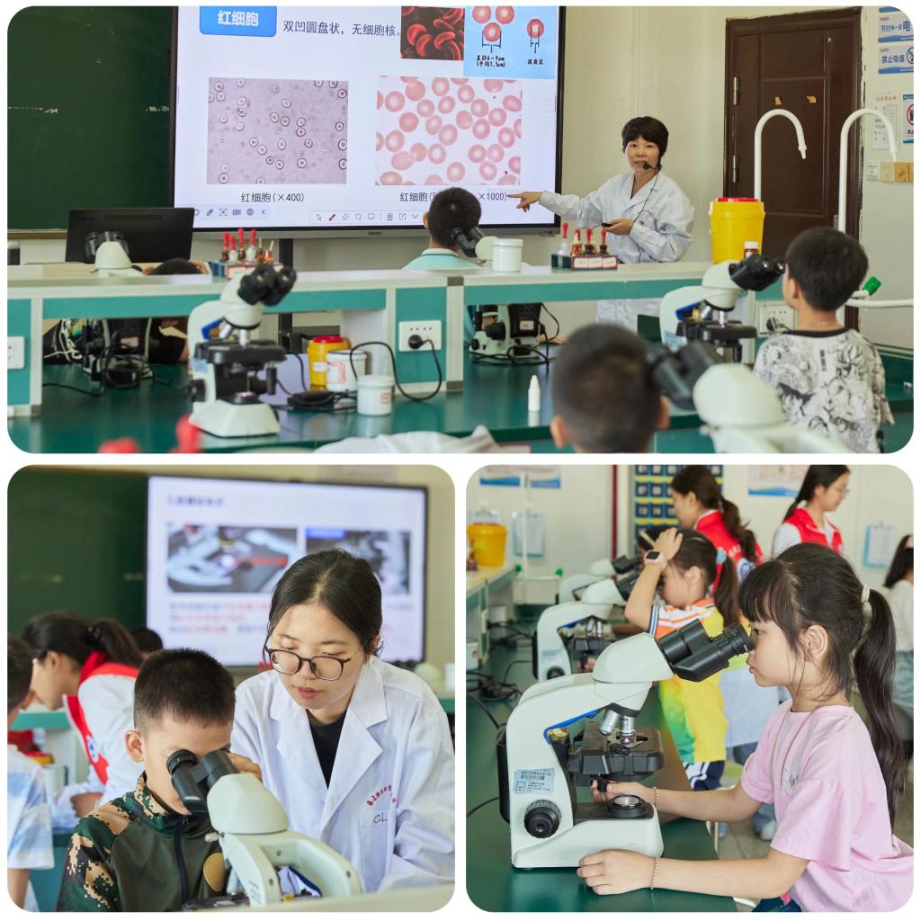 在专业老师和大学生志愿者的引导下,中小学生分组体验了6个科普项目,进行检验、影像、眼视光、医疗装备、医用电子等专业和职业初体验。在“微观世界探险家”中,同学们通过显微镜观察皮肤和口腔菌群;在“血液‘三侠客’”中认识红细胞、白细胞与血小板的超能力;在“奇妙唾液实验室”中动手验证酶的“甜蜜”作用;在“影像工坊”中感受磁共振、CT等大设备的大用处;在变身“电子小工匠”中制作会发光的电路板,体验医疗设备组装;在“小小视光师”中进行视力检测,学习如何呵护眼健康。