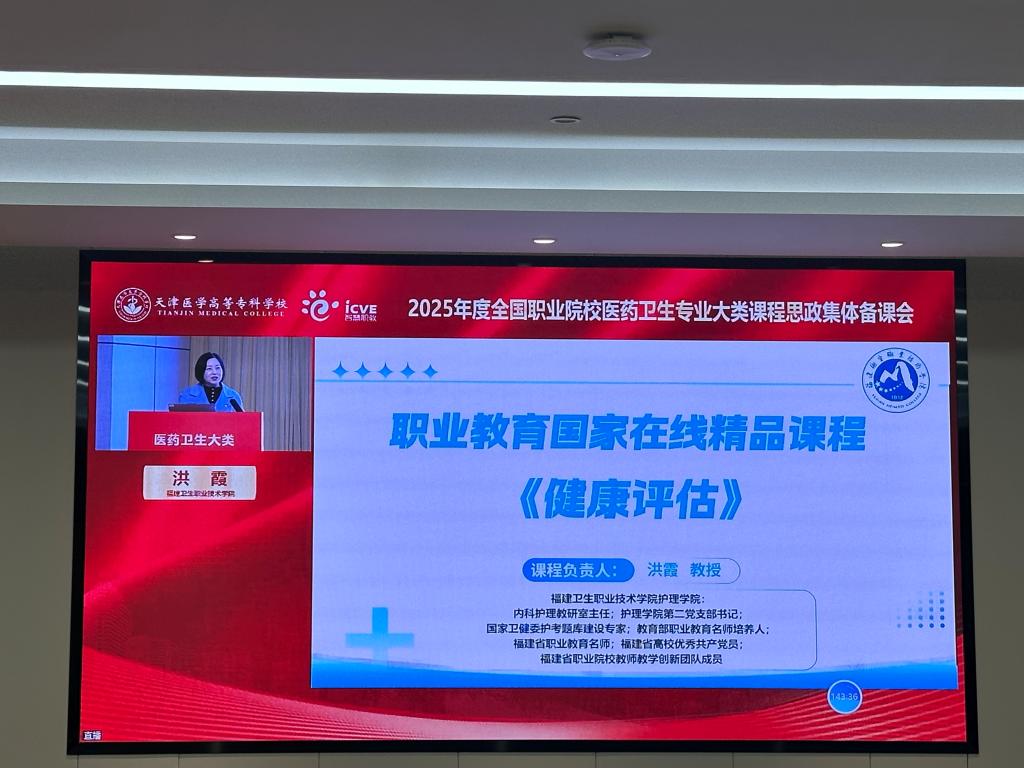 会议围绕国家医药卫生产业发展新趋势、技术创新方向以及职业教育改革政策进行深入解读,为课程思政建设提供宏观视野与实践指导。同时,大会组织了多场课程思政示范项目的说课展示与教学示范,来自全国优秀教学团队的教师代表分享了在课程设计、教学实施、育人成效等方面的创新经验。其中,来自我校护理学院的洪霞教授以《职业教育国家在线精品课程——健康评估》为题作专题发言,全面分享了该课程在教学目标设计、教学内容优化、数字化资源建设以及信息化教学方法应用等方面的系统化建设思路与实践经验。
