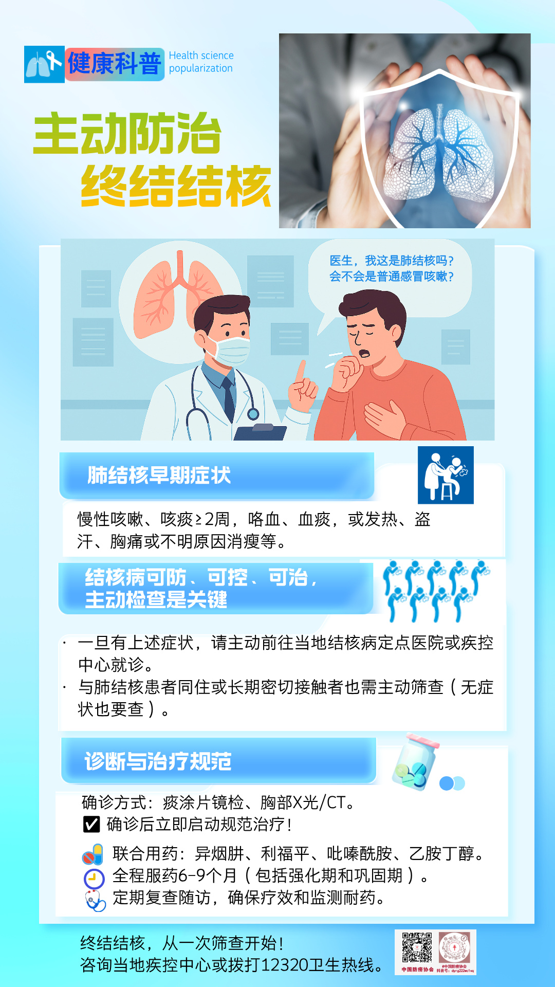 参赛作品《主动防治 终结结核》,以“可防、可控、可治”为核心传播理念,精准聚焦公众在结核病认知中的常见困惑与痛点。作品通过生动形象的图文与医患对话场景,将“咳嗽两周是否需要筛查”“确诊后如何规范治疗”等专业医学知识,转化为通俗易懂的公众语言。作品强调了“早诊早治”的关键作用,有效指导公众识别早期症状、主动参与筛查,为筑牢结核病防控的“第一道防线”提供了科学、实用的行动指南。