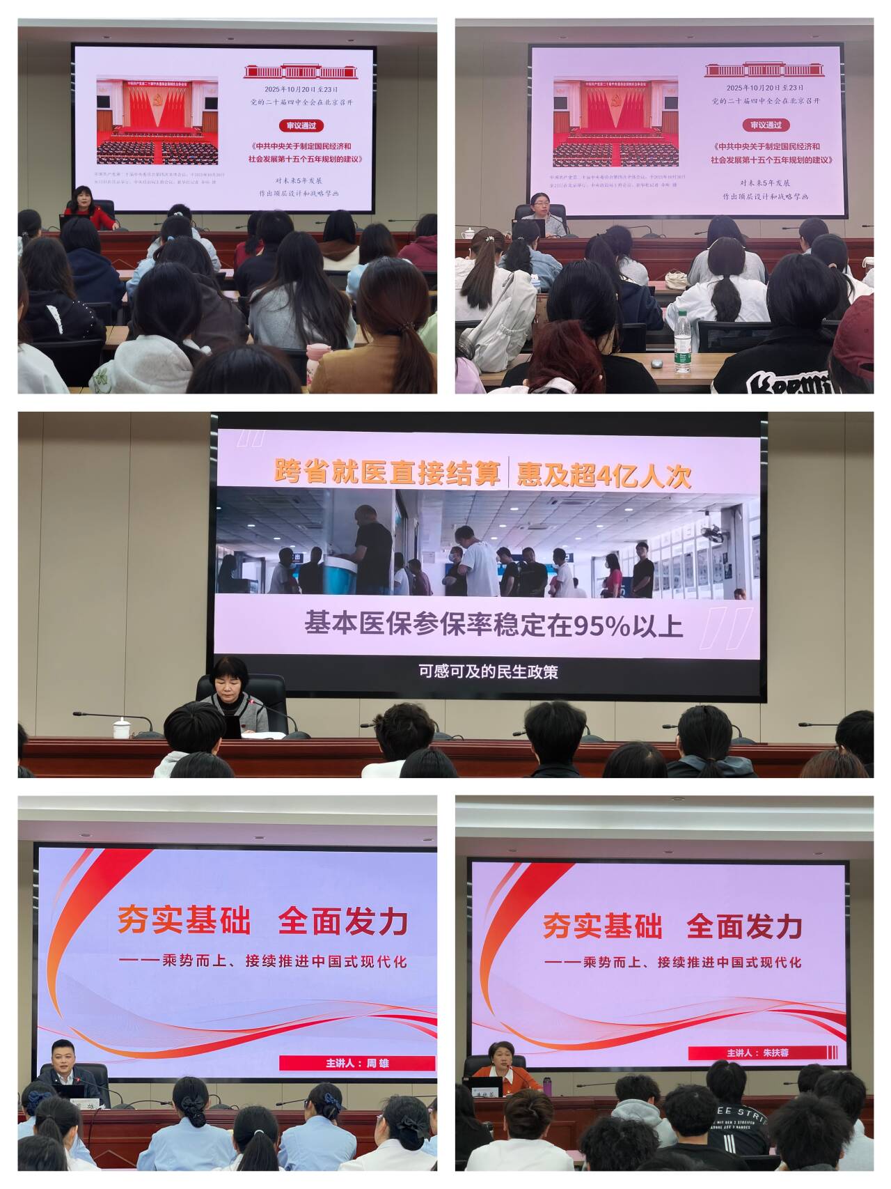 李美华、林玲、黄铭珊、周雄、朱扶蓉在授课中,聚焦我校“十五五”期间“一二三四五”的重点工作布局,以鲜活的案例为切口,直观展示了学校在专业建设、产教融合、社会服务等核心领域的显著成果与未来规划。他们强调,面向未来,学校将全面贯彻落实国家关于职业教育改革的决策部署,紧抓“新双高”建设与职业本科申报两大引擎,推动办学水平提档升级。他们勉励全体闽卫院学子,要珍视在校韶华,将专业技能锤炼成守护生命的底气,将个人志向融入卫生健康事业的高质量发展大局,在国家“十五五”新征程中,乘时代之风,蓄向上之势,成就出彩人生。