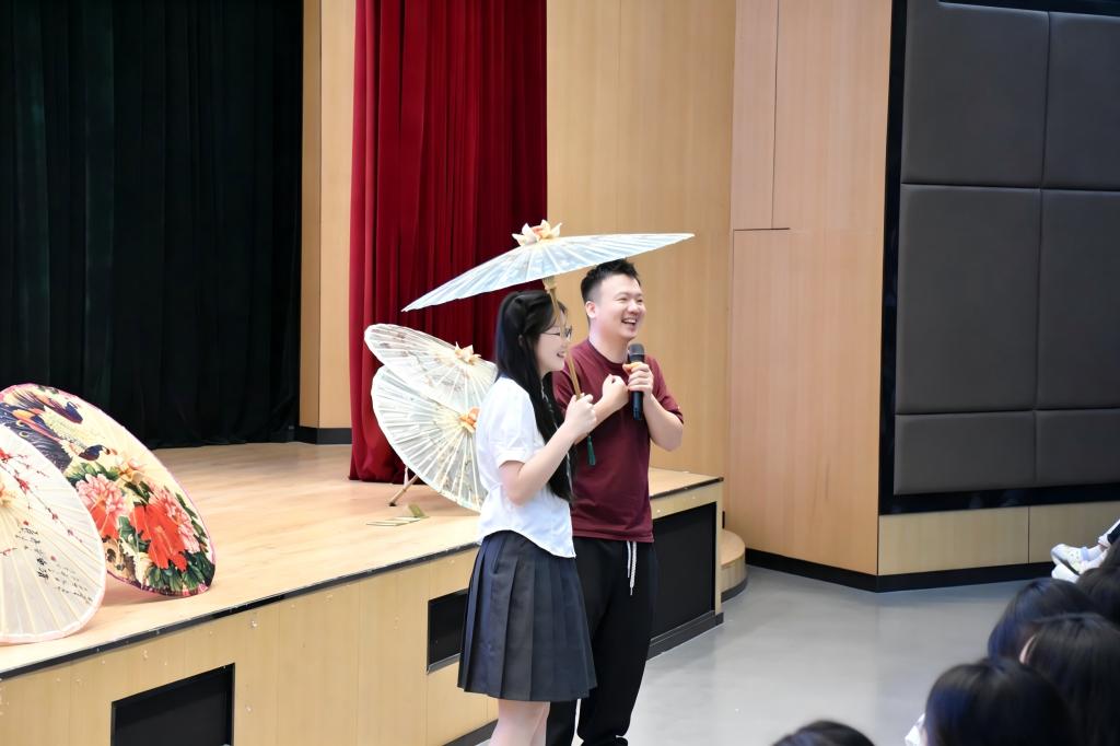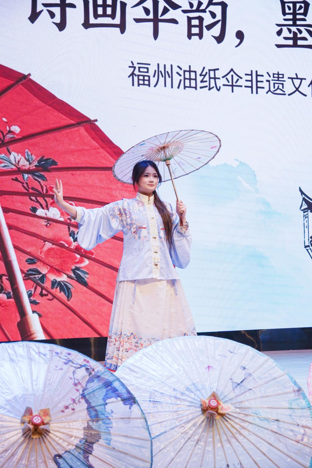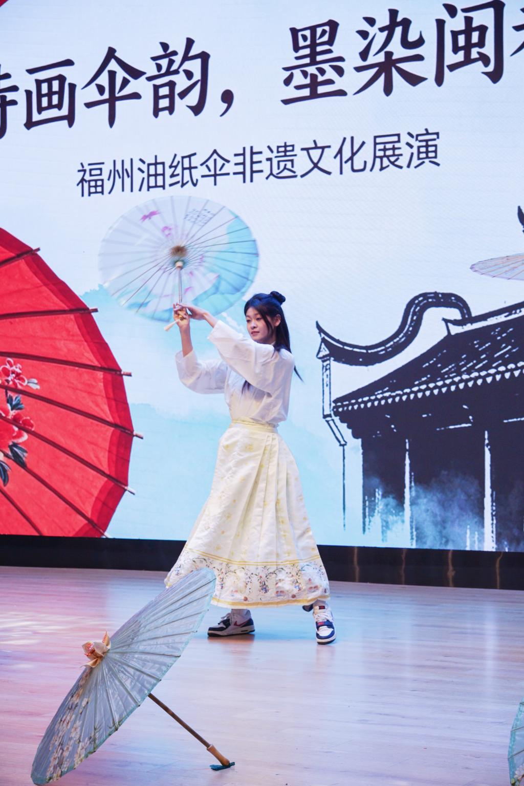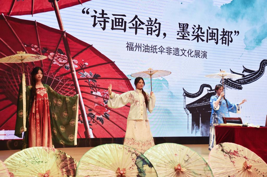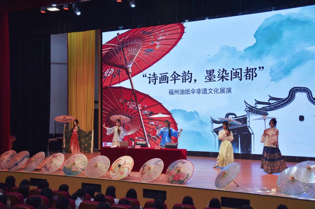 在悠扬的古乐声中,身着传统服饰的同学们手持由非遗传承人精心制作的福州油纸伞缓缓步入台前。伞面或绘有山水花鸟,或题写诗词雅句,色彩温润,线条细腻。一柄柄油纸伞在同学们的步履之间轻轻旋转、开合,仿佛将江南雨巷的诗意与闽都古城的温情一并带到现场。展演不仅展示了福州油纸伞的工艺之美,也让师生在视觉与意境的交融中,感受非遗文化穿越时空的生命力。