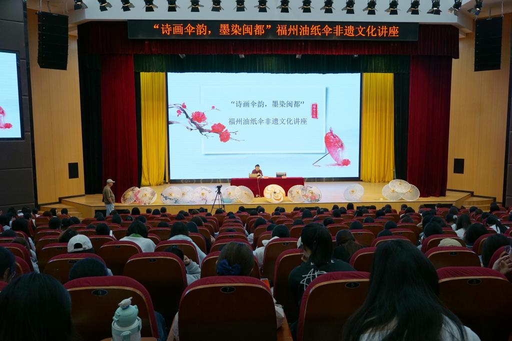 为弘扬中华优秀传统文化,推动非物质文化遗产在校园中的传承与发展,近日,由人文教学部与图书馆联合主办的“诗画伞韵,墨染闽都”福州油纸伞非遗文化讲座与体验活动在崇学厅顺利举行。本次讲座邀请福州油纸伞制作技艺非遗传承人严磊老师担任主讲嘉宾,校纪委书记林玲出席活动,四百余名师生参与活动,一同感受福州油纸伞这一传统技艺的独特魅力。