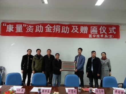 4月10日下午,“康量”资助金捐助暨授匾仪式在医学技术系三楼会议室隆重举行。福州康量医疗器械有限公司总经理林志烽、副总经理叶慧斌,我院副院长黄开良、特聘教授叶晨出席,学院学工处、医学技术系相关负责人及各教研室主任、辅导员、受资助学生共同参加了仪式。