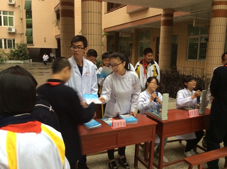 在急救技能培训的同时,我院志愿者还在十五中教学楼下,开展了健康咨询和义诊活动,内容包括了安全用药知识普及、测量血压血型、分发健康宣传手册等,还开设了以“口腔保健”、“常用药品使用”、“烧伤诊疗”为主题的三个小讲堂。整场活动氛围热烈,获得了在场师生的欢迎和好评。