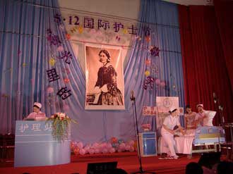 为庆祝2007年国际护士节,纪念近代护理的创始人南丁格尔,5月11日晚6时,由护理系、公共基础部联合举办的“ 烛光里的微笑”5.12国际护士节庆祝活动在学术厅举行。院临时党委书记陈明非、院副书记魏丽娜、公共基础部书记洪聿荣、护理系刘登蕉主任、谢涛书记、刘珍红副主任等领导及老师出席了此次晚会。