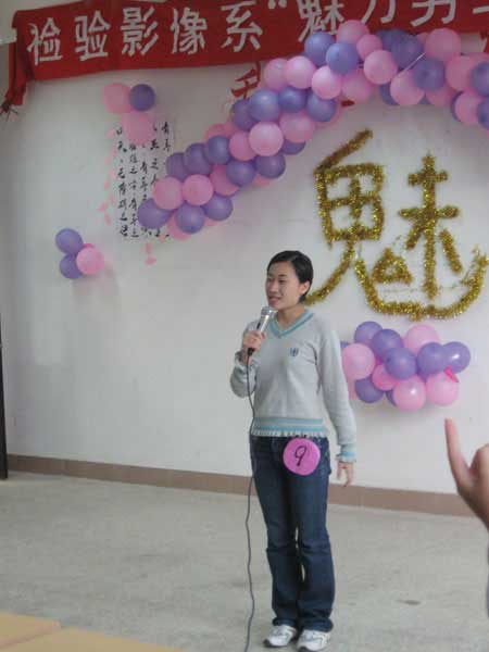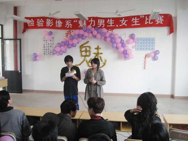 为加强校园精神文明建设,丰富校园第二课堂,活跃师生文化生活,学院定于2OO7年4月至5月举办以“文明校园因你——和谐”为主题的校园文化艺术节。 检验影像系于2007年4月26日下午在教学楼205举行了“魅力男生、女生”预选赛,本次活动有10余名选手参加,通过“个性才艺,你我争风”、综合知识问答、形象展示和“寻找同伴,同舟共济”4轮的比赛,最终评选出一、二、三等奖、鼓励奖和最佳人气奖。