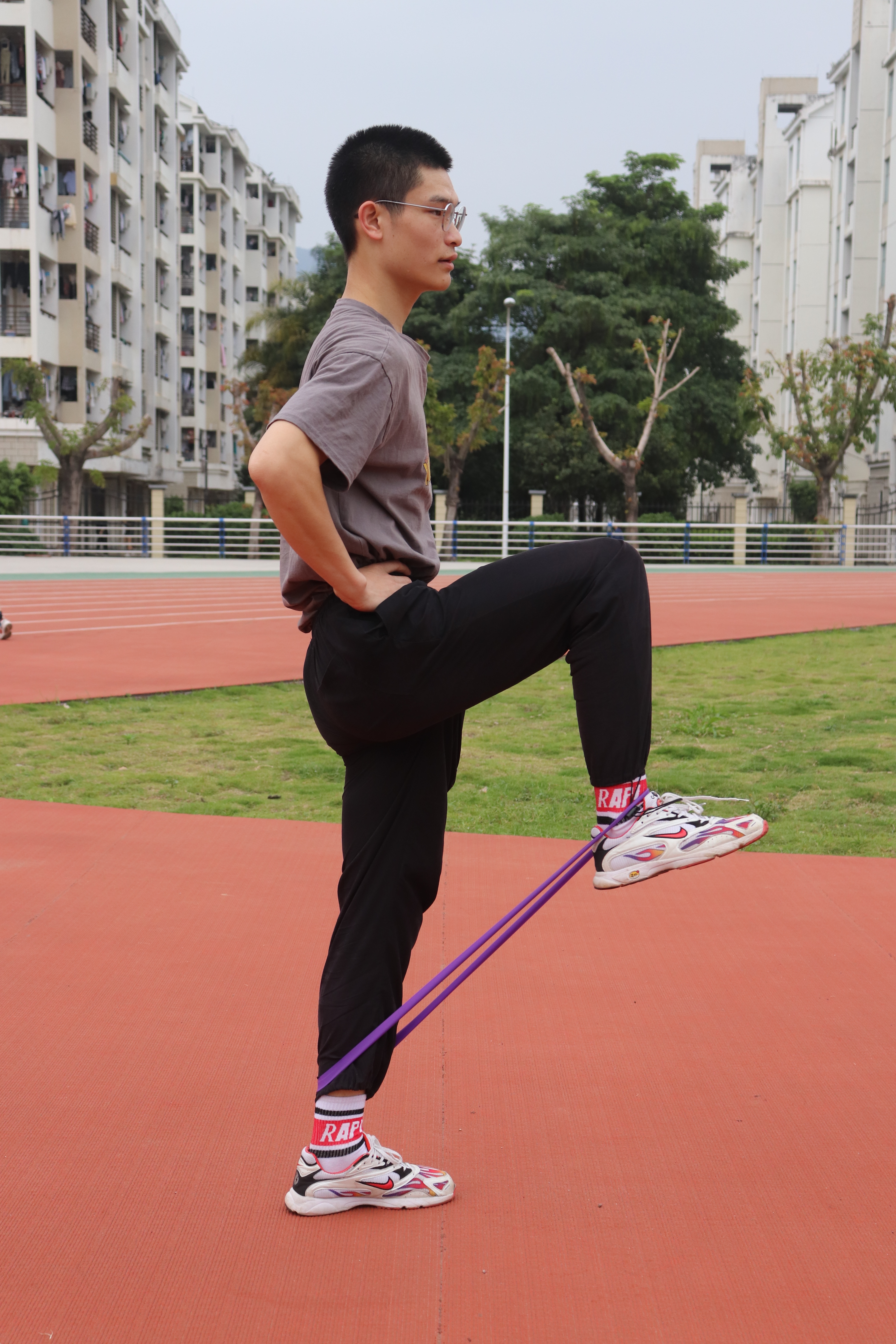 腿部肌肉力量练习:单足站立、阻力带正步走等;