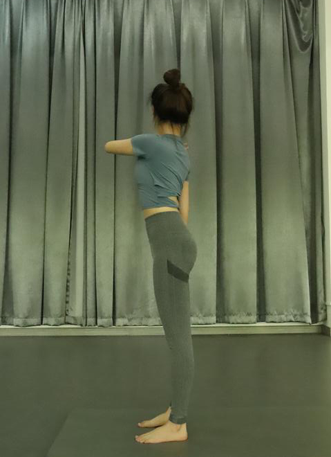 手臂伸展式:山式站立,吸气手臂举至头顶并交叉,两大臂贴于耳后根,呼气头微后仰注视双手交叉处,保持5个呼吸,吸气还原头部,呼气落下手臂。身体不要前倾或后仰,保持在一直线上不能塌腰,肩部、上背部肌肉向下伸展。