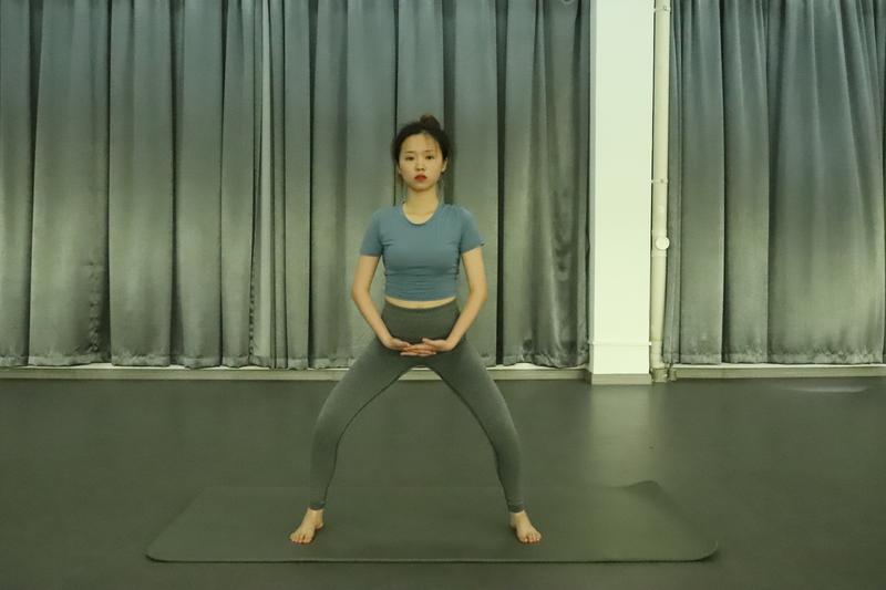 蹲式:双脚分开一倍半的肩宽,脚尖朝外,双手握拳自然垂放于体前,呼气屈双膝,身体向下蹲约30度,保持5个呼吸,呼气继续下蹲60度,保持5个呼吸,呼气继续下蹲90度,大腿与地面基本平行,保持3个呼吸,呼气继续下蹲到极限 ,双手和臀部略高于地面,保持3个呼吸,吸气慢慢伸直双腿,回到站立。心脏病、膝关节有伤者不宜练习。