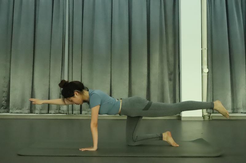 交叉爬行式:先跪坐于瑜伽垫上,抬起臀部,双膝分开与肩同宽(也可不分开),双手分开与肩同宽置于体前地面,手指分开,两中指相互平等,两大腿与手臂分别垂直于地面,形成四角板凳状,将身体重心移至左手和右腿,吸气左腿向向伸与地面平行,再将右臂向前伸直,与身体在同一水平面,目视前方,保持7个呼吸,呼气先落下右手,再落下左膝,换侧练习。腹部收紧使时背部保持平直,骨盆维持中立。