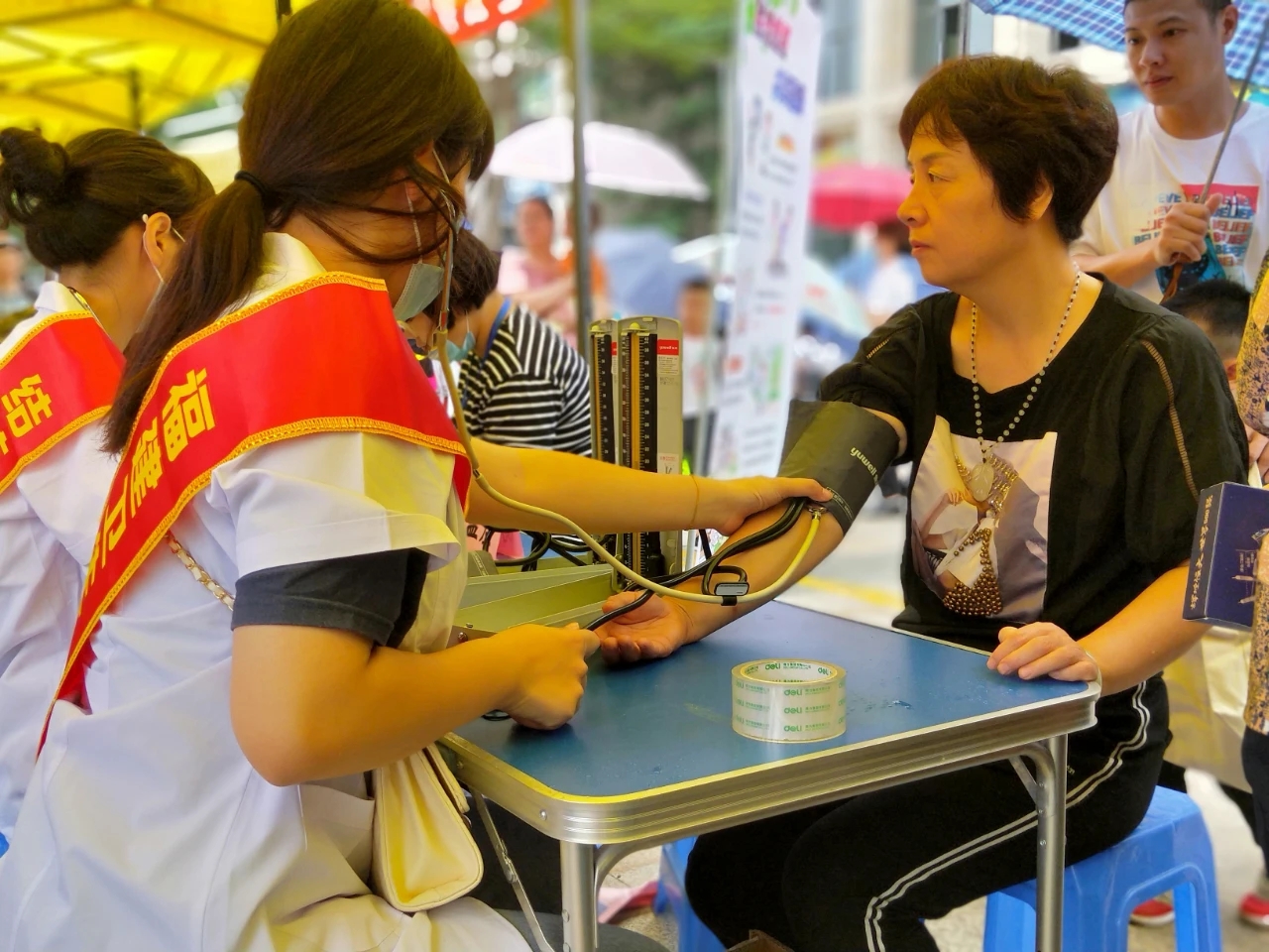 在义诊点,志愿者认真给每位前来参与的居民记录血压测量参数,并详细询问居民日常测量的血压值,掌握血压数值变化,以便更清楚地了解他们的血压情况,提供合适的健康宣教。针对社区居民阐述的一些身体上的不适与疑问,志愿者适时开展心脑血管疾病、糖尿病、肺结核等常见病的宣教,给予合理的饮食建议,提醒居民适当锻炼并保持愉悦的心情,提高居民对常见病的重视度,提升健康意识。