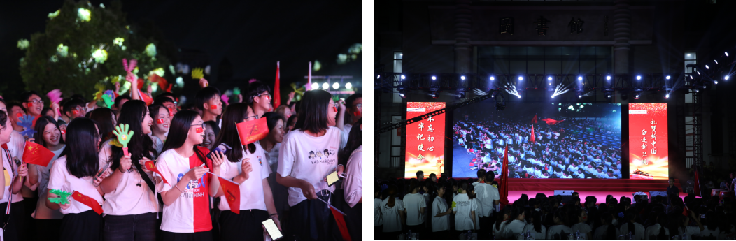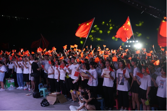 院关工委领导严肃主任也出席活动,并与5位演职人员上台共同唱响《我和我的祖国》。在他们的带动下,全场起立,800人共同挥舞手中的国旗,唱出心中对祖国的无限深情,歌声响彻学院上空。