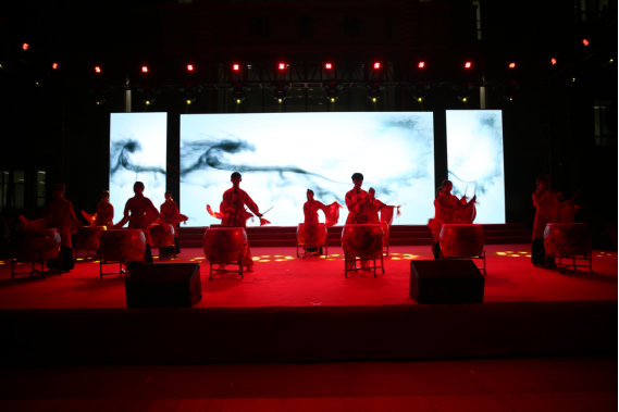 红衣翩翩,鼓点阵阵,晚会由护理系、药学系选送的水鼓舞表演《龙的传人》拉开序幕。