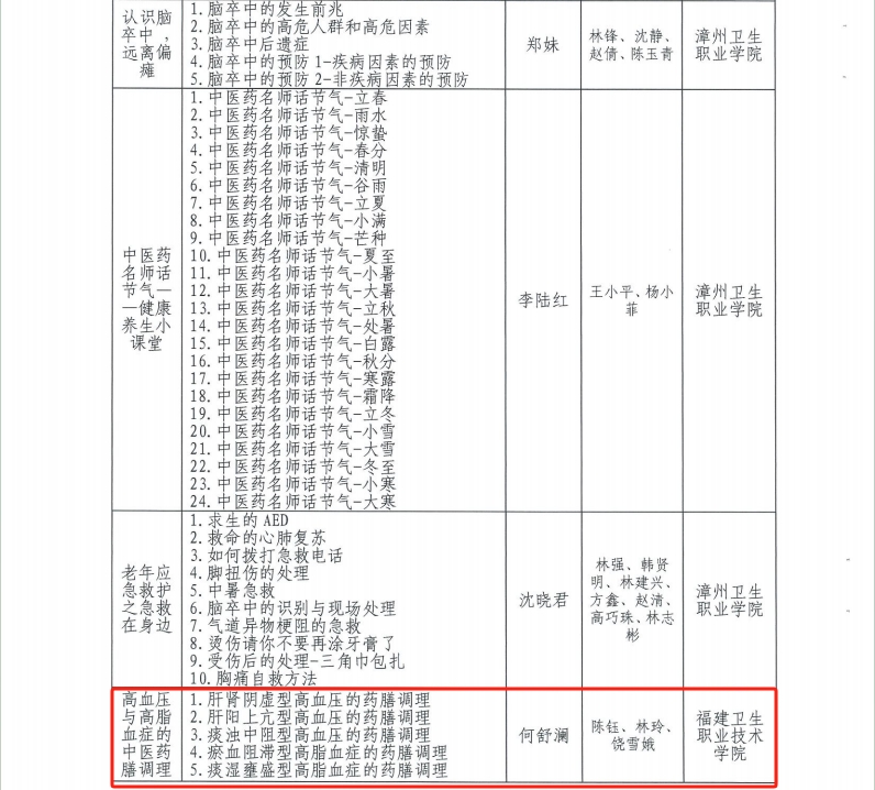 近日,福建省终身教育促进委员会公布了2023年福建省终身教育提质培优项目,我校前期申报的4个项目成功入选,其中健康管理系陈爱珍老师申报的《基层公共卫生终身教育创新基地》入选终身教育创新基地;医学院林国威老师申报的《老年人智慧健康伴侣实验项目》、医学技术系钟伟雄老师申报的《智慧医疗终身教育实验项目》入选终身教育实验项目;教务处何舒澜老师申报的《高血压与高脂血症的中医药膳调理》入选社区(老年)教育课程资源。