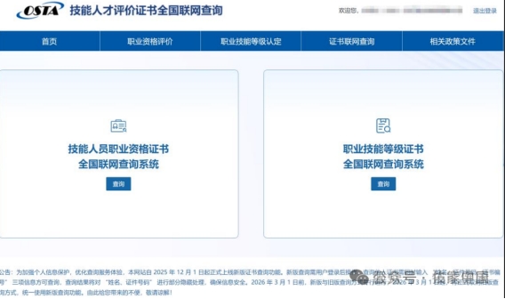 为保障个人信息安全,2025年12月1日技能人才评价工作网站新版证书查询功能上线。新版证书查询方式说明如下: