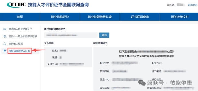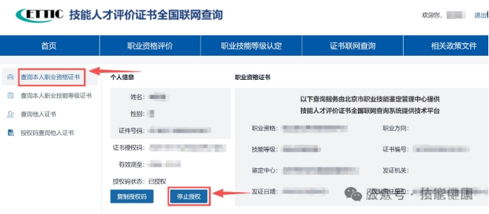3.个人用户可通过授权码方式,分别授权他人查询本人名下职业资格证书或职业技能等级证书,查询结果显示证书的完整信息。授权码有效期一年,可随时登录账户终止授权。