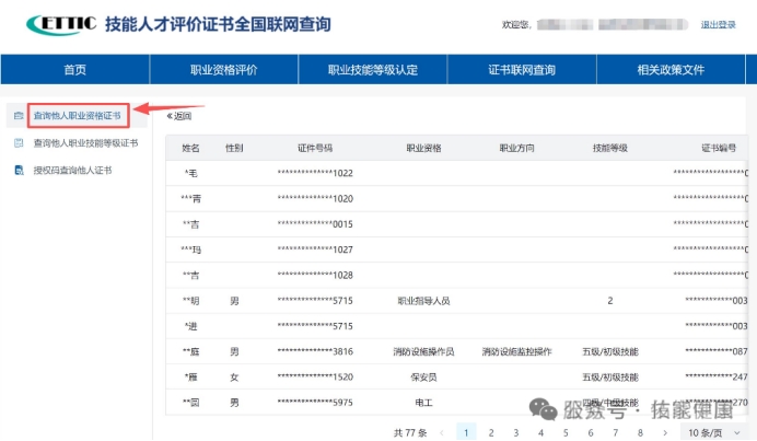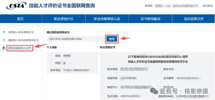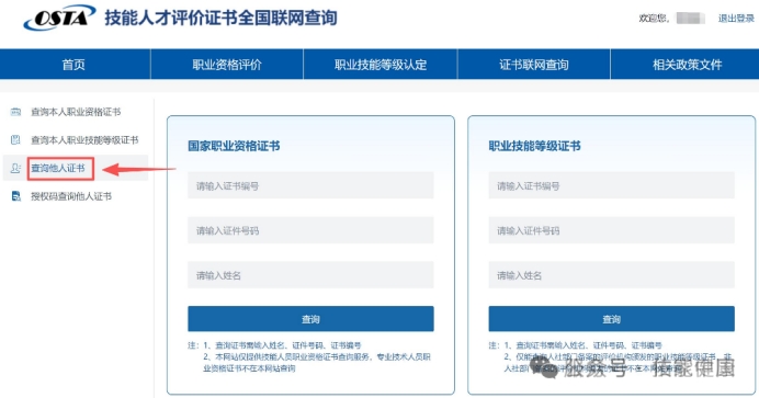 路径:登录后→左侧菜单栏→【查询他人职业资格证书/查询他人职业技能等级证书】步骤: