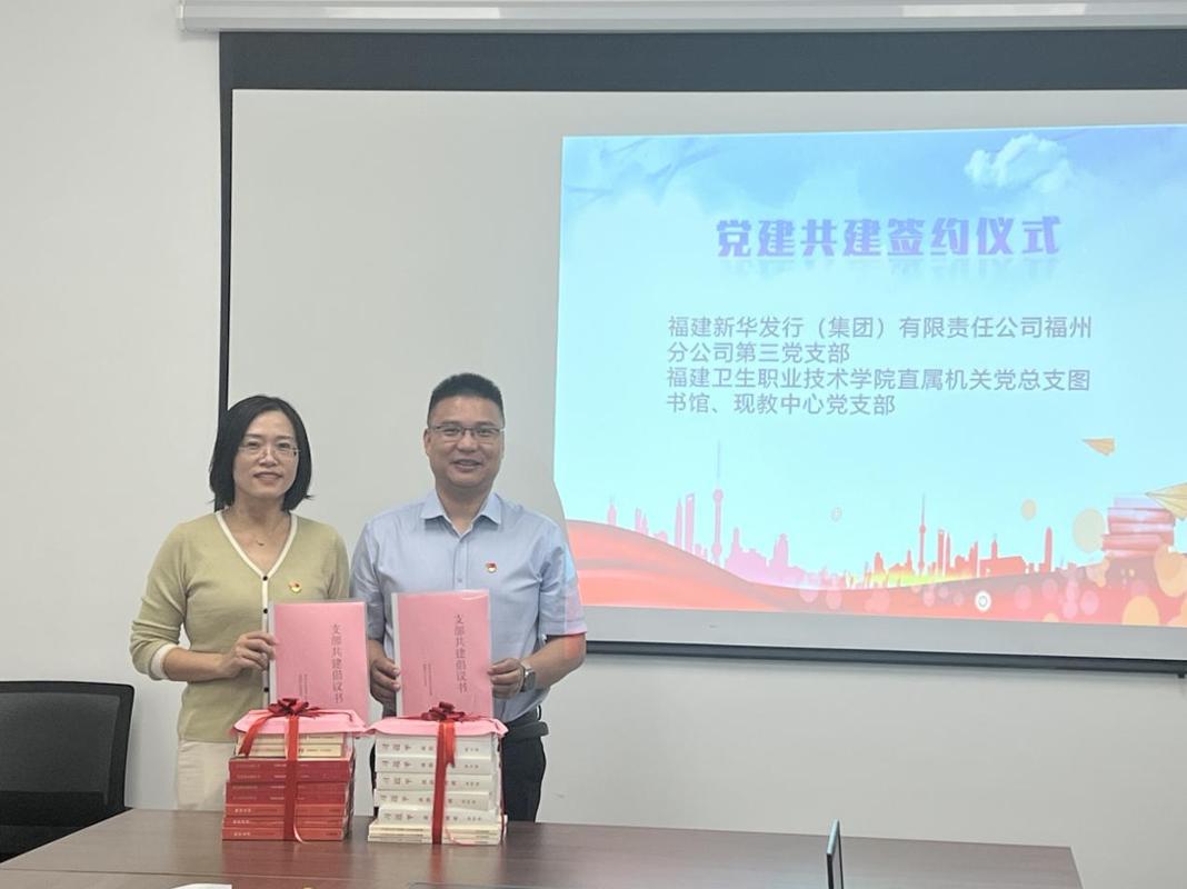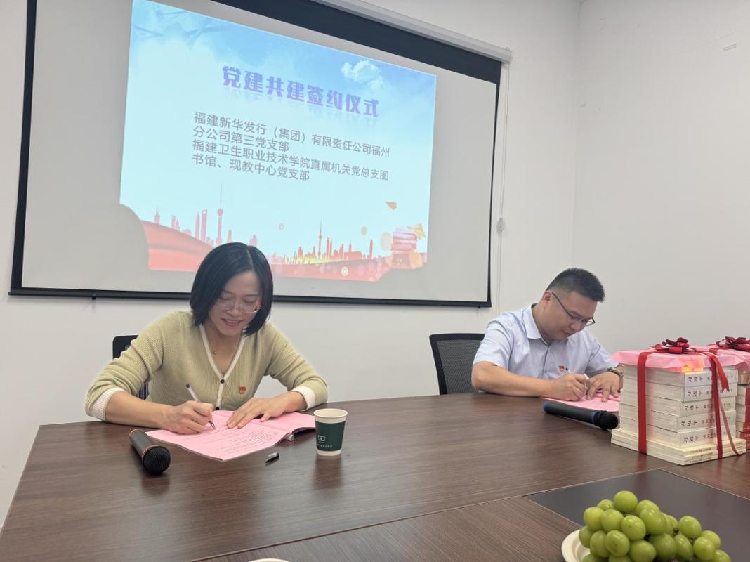 参观结束后,双方党支部举行了简洁而庄重的《党建共建协议书》签约仪式。签约仪式后,现场开展了“红色书香在行动”实践共建活动,福建新华发行集团福州分公司第三党支部现场向我校图书馆捐赠了《习近平新时代中国特色社会主义思想专题摘编》等一批红色经典读物,丰富了学校的馆藏资源。