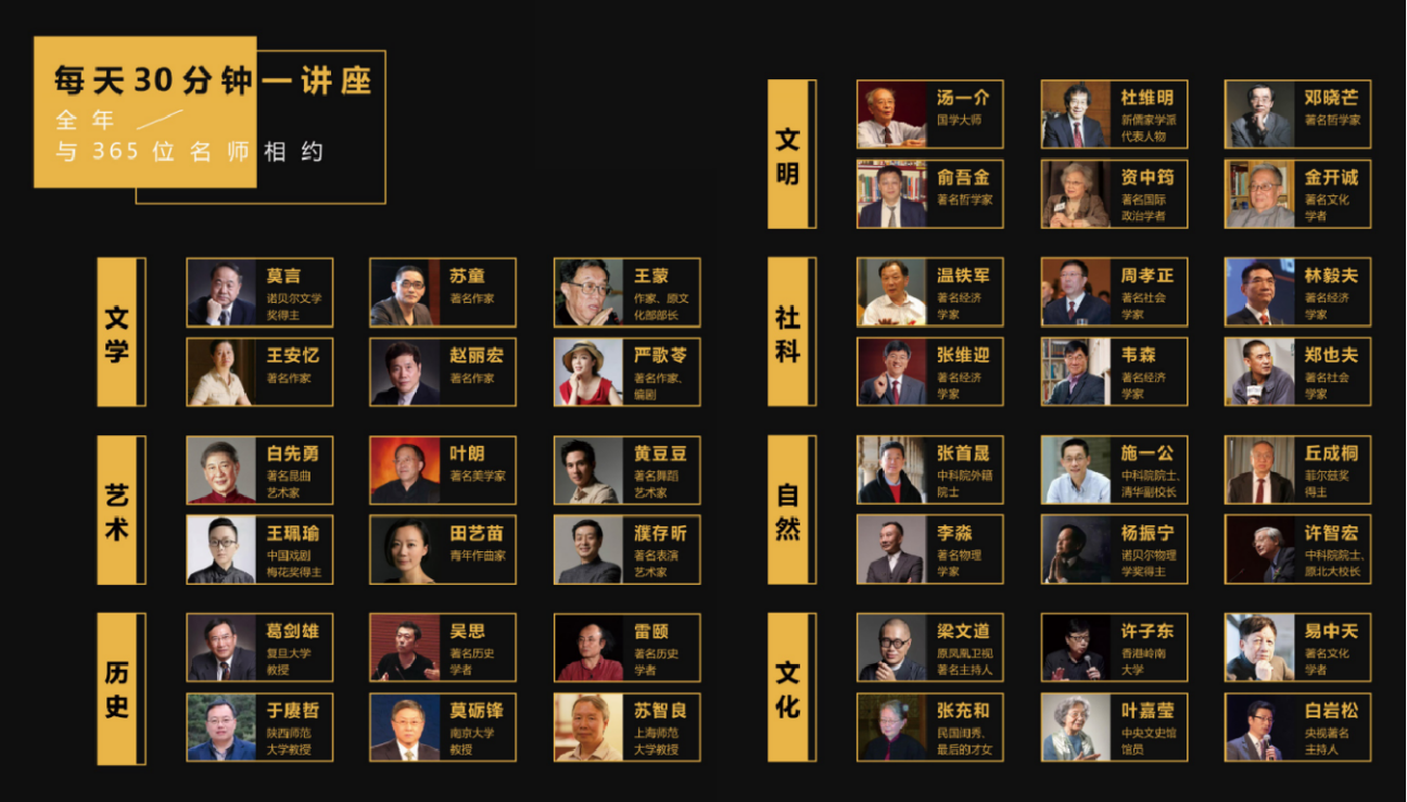 “超星名师讲坛”汇集10000+名师超50000小时视频,内容包含文学、艺术、历史、自然、文化等领域,每天30分钟一讲座,大咖云集如下: