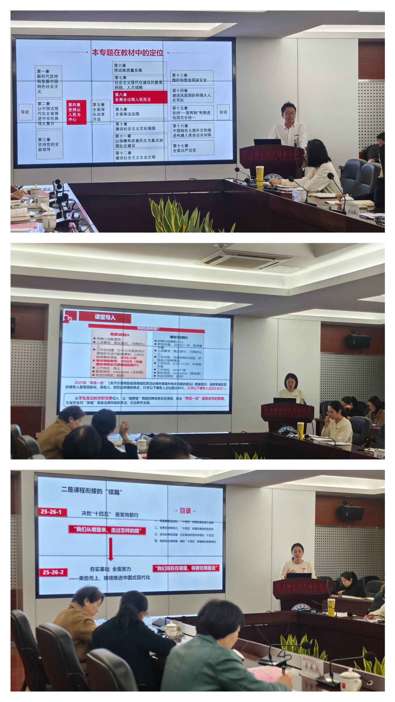 集备会上,我校张天文老师围绕《习近平新时代中国特色社会主义思想概论》专题四“新时代中国特色社会主义政治建设——价值旨归与民主实践”展开集备;罗芸老师聚焦《思想道德与法治》专题七“学习法治思想提升法治素养”进行展示;张茵珠老师围绕《形势与政策》专题一“夯实基础 全面发力——乘势而上、持续推进中国式现代化”进行集备。三位教师凝心聚力、各展所长,以精准定位锚定方向,以科学设计搭建框架,以优质内容筑牢根基,以创新手段赋能课堂,系统梳理教学逻辑,精准突破重难点,精选福建地域特色与校本化素材,有机融入信息化教学技术,对接学校事业发展方向,将宏大叙事转化为青年学生可感可知、可行可践的成长指南。