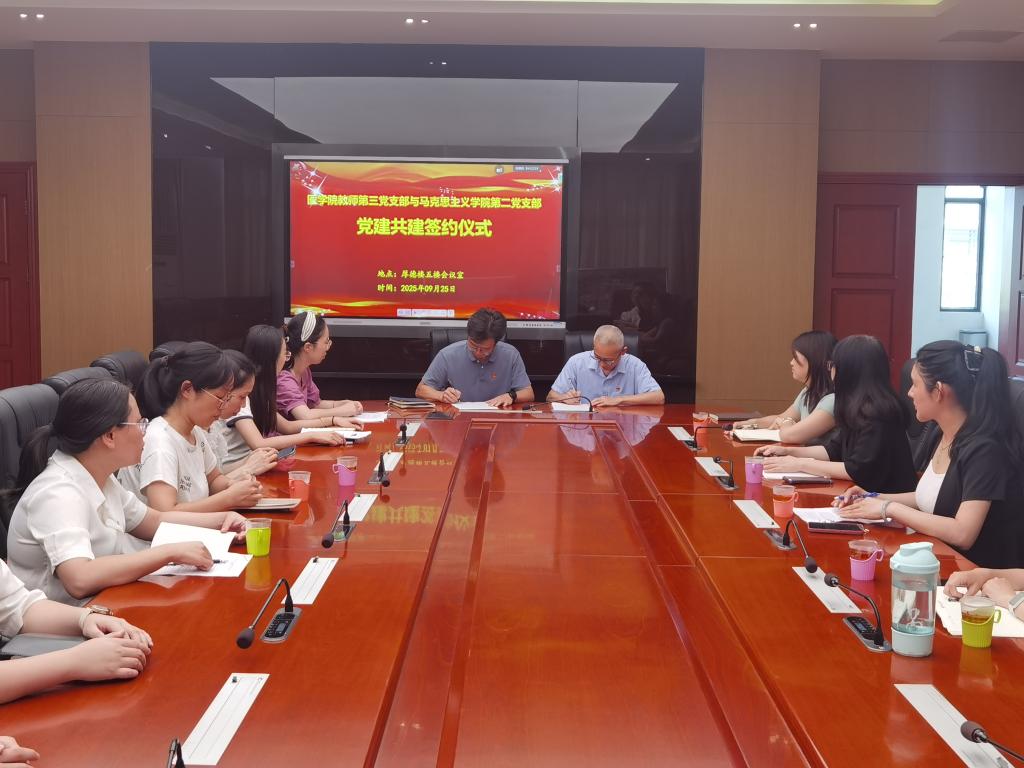 为积极推进基层党建工作创新,推进马克思主义学院和专业院系在落实立德树人根本任务上的深度融合,2025年9月25日,马克思主义学院第二党支部与医学院教师第三党支部在厚德楼五楼会议室举行党建共建签约仪式。共建双方表示,将以此为契机,在新起点上实现资源共享、优势互补,共同提升党建工作水平和教学业务水平。