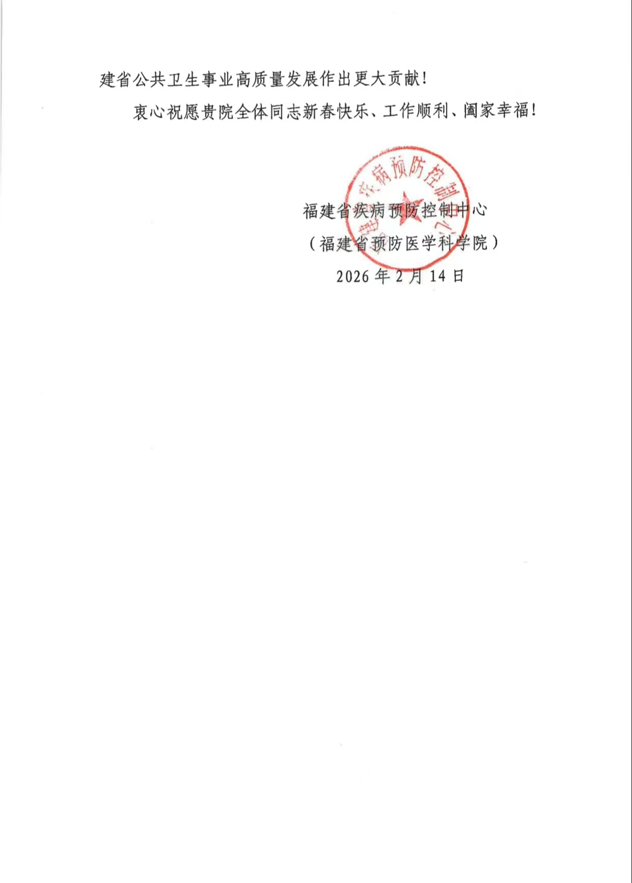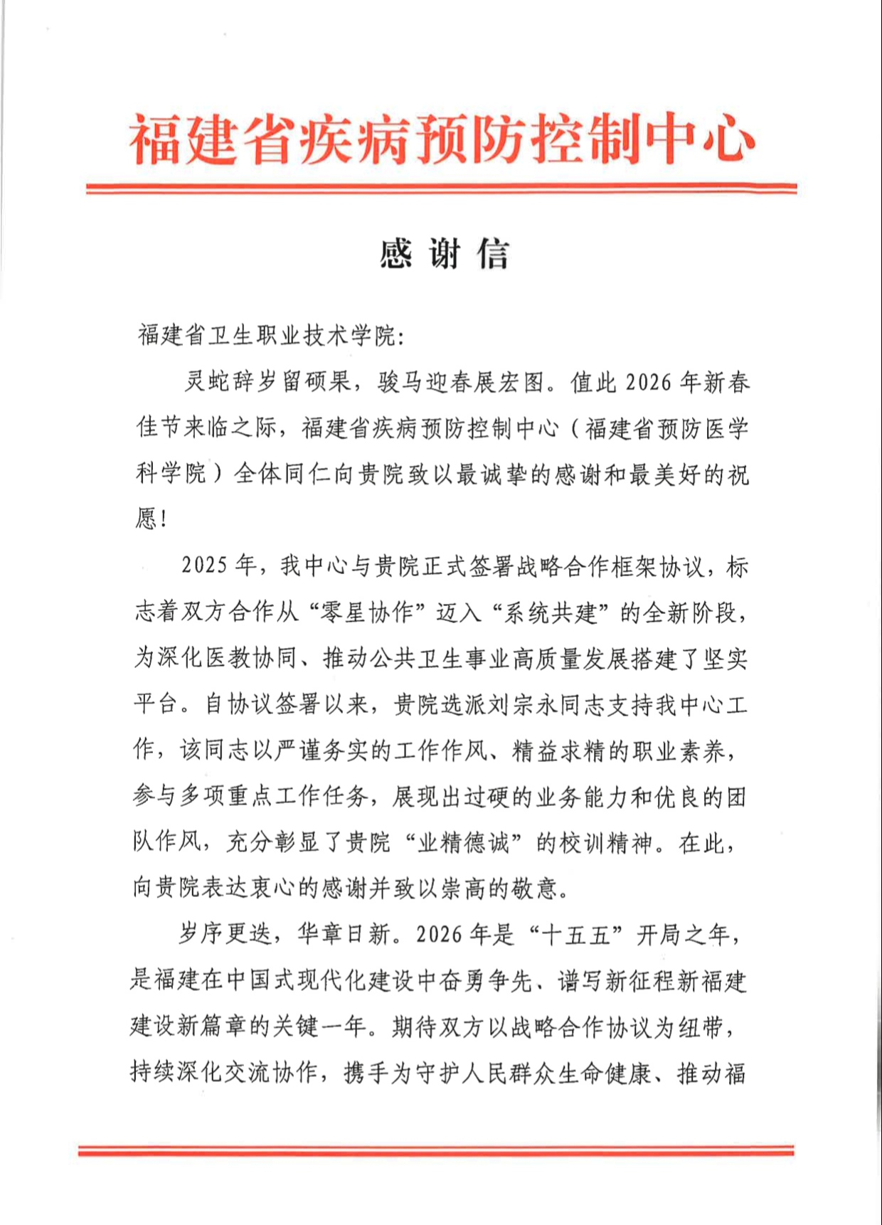 近日,我校收到福建省疾病预防控制中心发来的感谢信,信中对我校选派刘宗永同志支持中心多项重点工作表示感谢,并对我校广大干部职工致以新春问候。