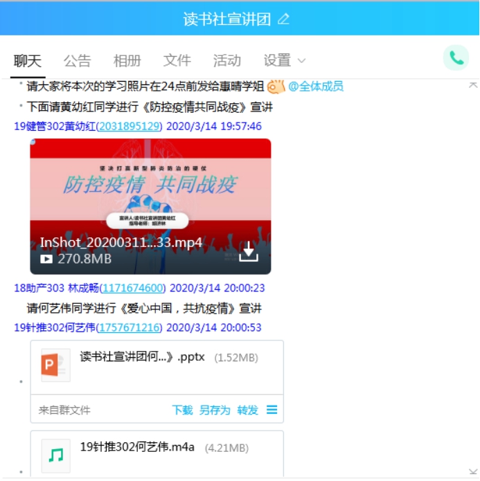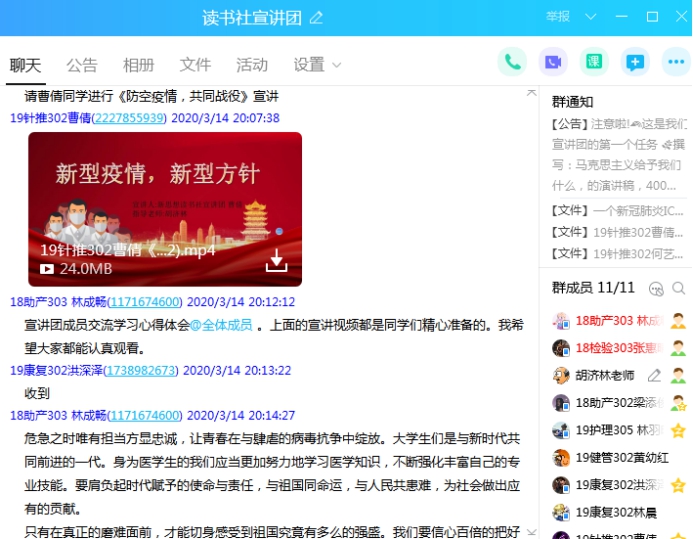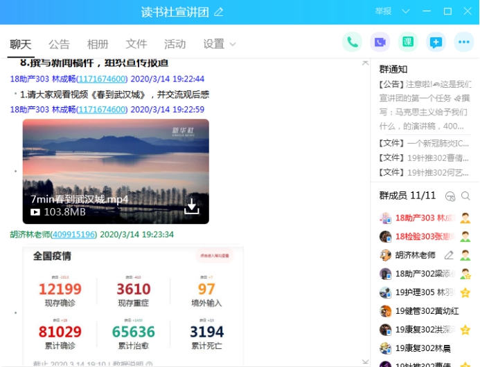 “只待三月春风来,樱花翩翩终始开。”三月是个美丽的季节,愿时光不负努力,生活总会多一些明媚。经过前期宣讲团成员们的充分准备,我们于2020年3月14日19:20分,开展了“同舟共济,全民战‘役'”宣讲活动,出席此次活动的不只有读书社宣讲团全体成员,还有指导老师——胡济林老师,此次宣“疫”活动是以线上的方式在宣讲团qq群中开展。