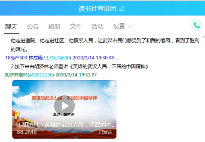 在活动开始前,由团长组织签到点名。活动正式开始后,第一个环节是全体成员观看视频《春到武汉城》并在群里进行观后感交流。通过观看视频大家体会到了全国人民齐心抗击疫情的决心和永不服输的精神,还感受到了党和国家对于人民生命健康的高度重视,同时也看到战胜疫情的希望。