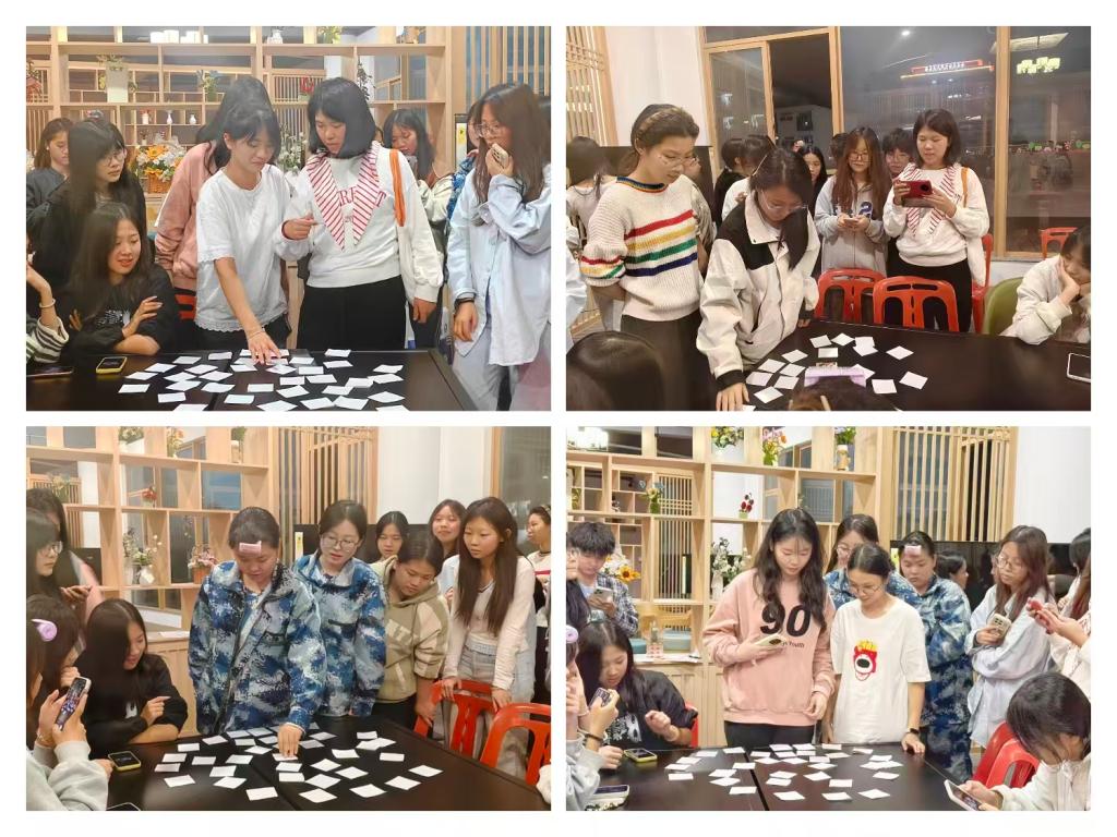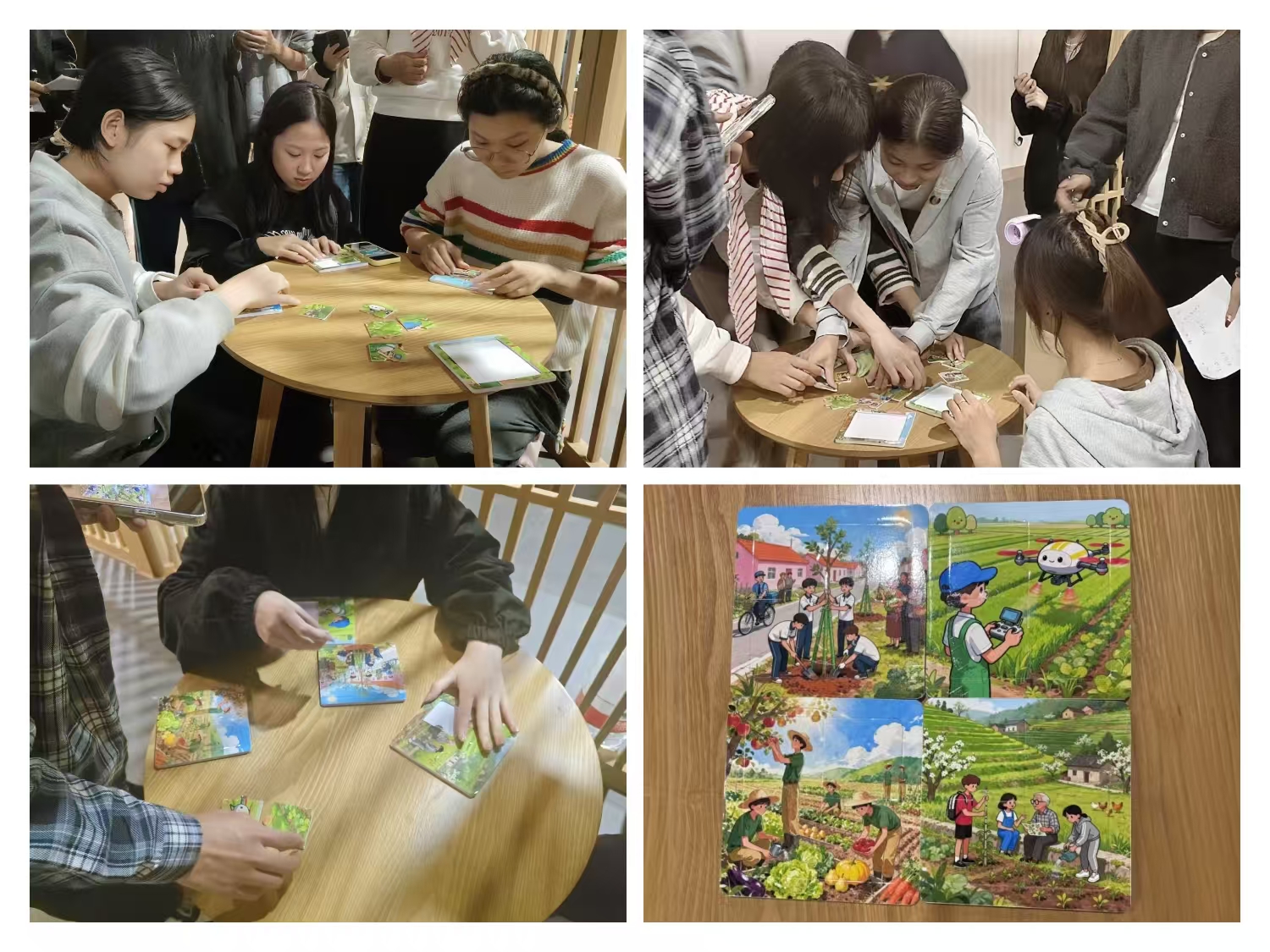 正式活动环节共设置了“重阳对对碰”“三农拼拼乐”以及“知识问答”三大关卡。在“重阳对对碰”里,同学们组队翻牌,匹配重阳习俗及其寓意,在游戏中梳理登高、赏菊等传统习俗和农耕文明之间的联系;“三农拼拼乐”环节中,各个小组接力完成乡村振兴成果拼图,通过辨别“人才、技术、产业、生态”方面的振兴场景,加深对三农发展核心维度的记忆;“知识问答”环节融合了重阳习俗及三农相关文化题,让同学们在答题时进一步丰富了知识储备。