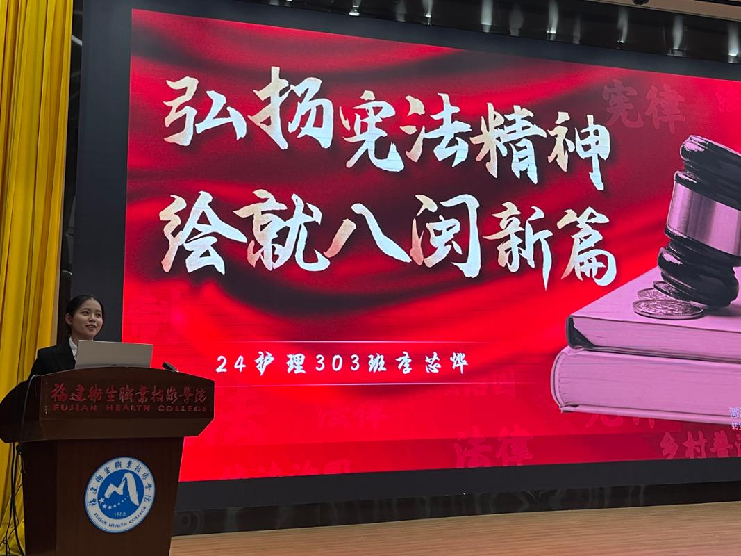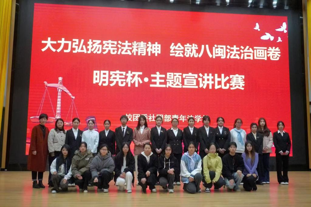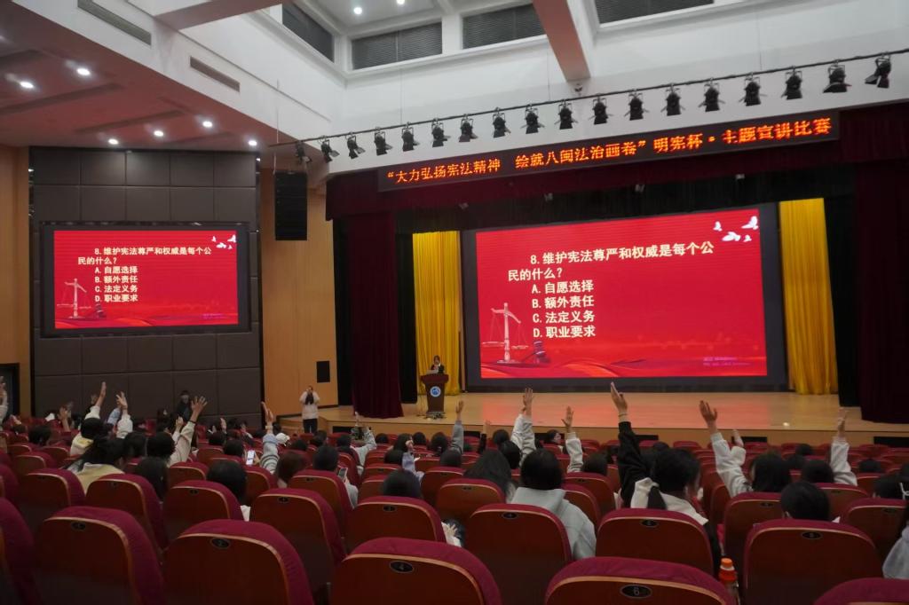 活动以“深化宪法认知、提升法治素养”为核心目标,既助力参与者筑牢宪法认同、锤炼法治思维与宣讲表达能力,推动宪法精神从理论认知向行动践行转化;更以活动为纽带,带动更多同学主动学法知法,营造校园尊宪护宪的浓厚氛围,厚植青年学子的法治信仰与责任担当,夯实德育与法治教育根基。现场设置宪法知识竞答环节,观众积极抢答,互动热烈,氛围轻松活跃;决赛阶段,选手依次登台宣讲,展现对“宪法+八闽”主题的深刻理解。活动尾声,评委围绕“主题契合度、内容创新性、价值引领力”三大维度综合考评打分,最终评选出一等奖1名、二等奖2名、三等奖3名。