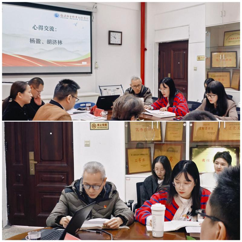 在交流环节,马院副院长杨盈与第二党支部书记胡济林结合领学内容与工作实际,分享了学习心得。他们的发言既有理论高度,又体现实践思考,展现出扎实的政治担当与专业素养。