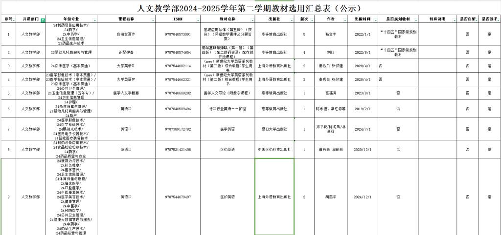 现将人文教学部2024-2025学年第二学期教材选用情况(经人文教学部教材建设小组审议通过)公示如下,公示期自2024年12月16日至2024年12月23日,若有异议,可以书面或来电方式反映公示对象的有关情况和问题。