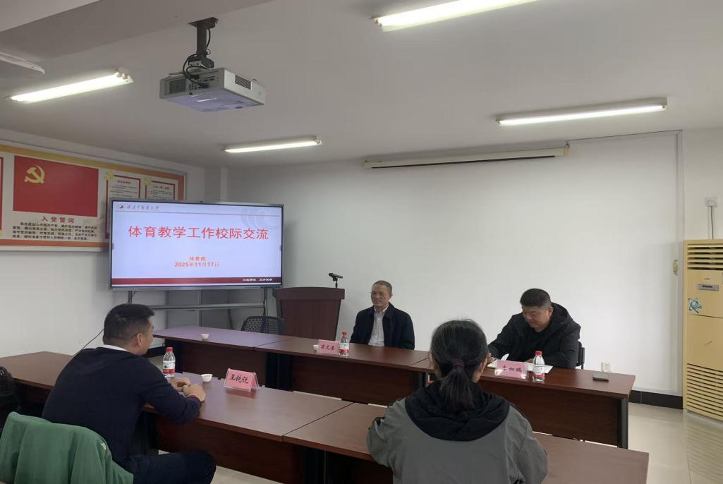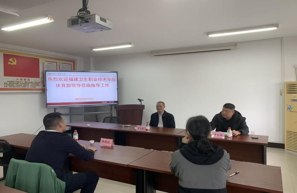 本次座谈于2025年11月17日在中医药大学体育部会议室举行。我支部书记阮秋容和主任王钝锐和中医药大学体育部党总支书记翁文泰、体育部副主任李加鹏,办公室主任陈金辉、双方围绕“党建引领,构建医体融合育人新格局”的主题进行了深入的交流。