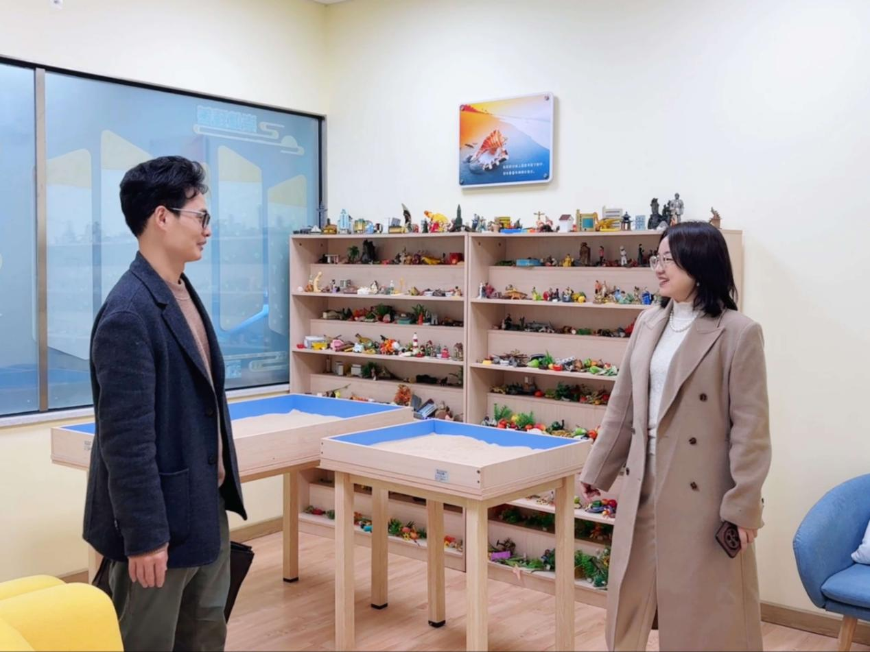 讲座结束后,丘文福老师专程走访我校心理健康教育中心,逐一察看心理预约区、心理宣泄室、团体心理辅导室、沙盘室等功能分区,仔细询问各功能室的具体用途,还亲自体验了心理宣泄仪等专业设备,对中心的整体规划布局与建设成果给予了认可。